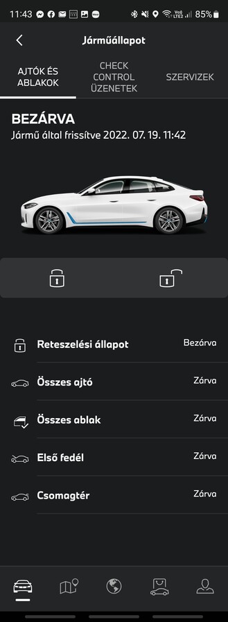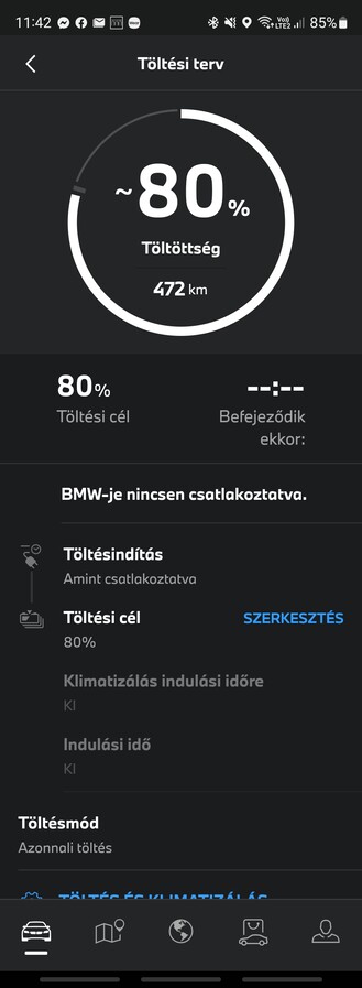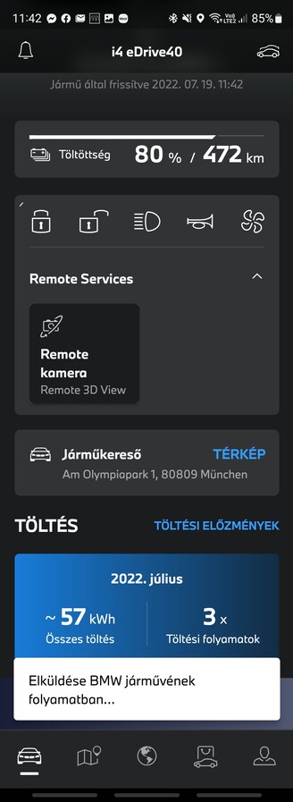 Ha van egy BMW-d, akkor a myBMW app nagyon javasolt. Az alvázszámot kell megadni a regisztráció után, majd küld a rendszer egy kódot a kocsinak (tehát benne kell ülni a folyamat során), ami a fedélzeti rendszeren megjelenik, ezt kell visszaütni az alkalmazásba és készen is vagyunk. Innentől látjuk a szokásos dolgokat: töltöttség, becsült hatótáv, ajtók állapota, a verda lokációja, ezeken felül lehet állítani a folyamatban levő töltés paramétereit, kapcsolhatunk klímát, lámpát, dudát(!) a távolból, illetve meg lehet nézni a kamerák képét, ami a stalkolás egy meglehetősen új szintje, de itthon speciel nem működik pont jogi okok miatt. Természetesen lehet útvonalat tervezni az appban (töltési pontokkal automatikusan számol hatótávon kívül eső célpontnál) és átküldeni az autónak, de erre a gyári navit tudjuk csak megkérni.