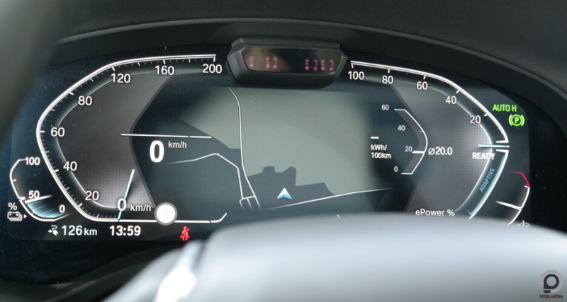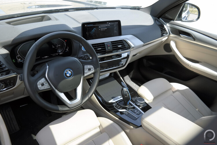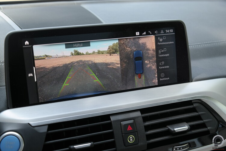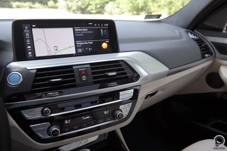 Hagyományos értelemben vett műszerfallal és órákkal nyilván nem találkozunk az iX3-ban, az információk tömege a kormány mögötti kijelzőről (12,3 hüvelyk) és a központi kijelzőről (10,5 hüvelyk) jut el hozzánk, előbbin nyilván a vezetéssel kapcsolatos közvetlen adatokat tekinthetjük át gyorsan, és ha a bal bajuszkapcsolón klikkeljük a BC-t (boardcomputer), az is ezen a képernyőn váltogatja a különféle számokat, de a navigáció térképét is láthatjuk a virtuális órák között. Középen egy widgetes, könnyen testre szabható menürendszer uralkodik, ahova mindenféle gyári alkalmazást kipakolhatunk, a navigáció mellett két kisebb (időjárás, fogyasztásmonitor, hírek, stb.) ablak fér el, de az autó mindenféle beállítását is innen érhetjük el.