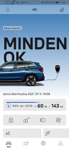 6,8 másodperces a 0-100-as sprint, nagyjából ugyanez kijön a gyakorlatban is: a BMW sem azt a döbbenetes, extrém gyorsulást és menetdinamikát adja az elektromos autóival, mint például a Tesla vagy a Jaguar, viszont nyilván nincs olyan szituáció, ahol ne lenne elég a teljesítmény, és ha valaki még nem ült erősebb elektromos autóban, annak bizony döbbenetes lesz ez a gyorsulás is, nem feltétlenül az idő miatt, hanem a folyamatosság és a hangtalanság miatt. A menetválasztó kart D és B állás közt váltogatva érezhetjük meg a rekuperálás erejét, ez utóbbi mód egyébként teljesen teletöltött akkumulátor esetén is masszív motorféket tud produkálni, tehát ettől nem függ a hatásfoka, adaptív mivoltából eredően viszont minden mástól igen, autópályán kevésbé fejti ki erejét, városban viszont nagyon komolyan megfogja az autót, és egy-egy piros lámpára sokszor egészen agresszíven tud lassítani, a városi egypedálos vezetés kis előrelátással minden további nélkül működik. Az autóhoz tartozó My BMW alkalmazás nem csak az autó pozícióját, töltöttségét mutatja meg, és adott esetben távoli nyitás-zárásra teszi alkalmassá mobilunkat, de bizonyos országokban (ahol nincs jogi akadálya) távolról tudja aktiválni az autó kameráit, és dudáltatni is tudja a kocsit, ha épp egy parkolóházban keressük, hogy hol van.