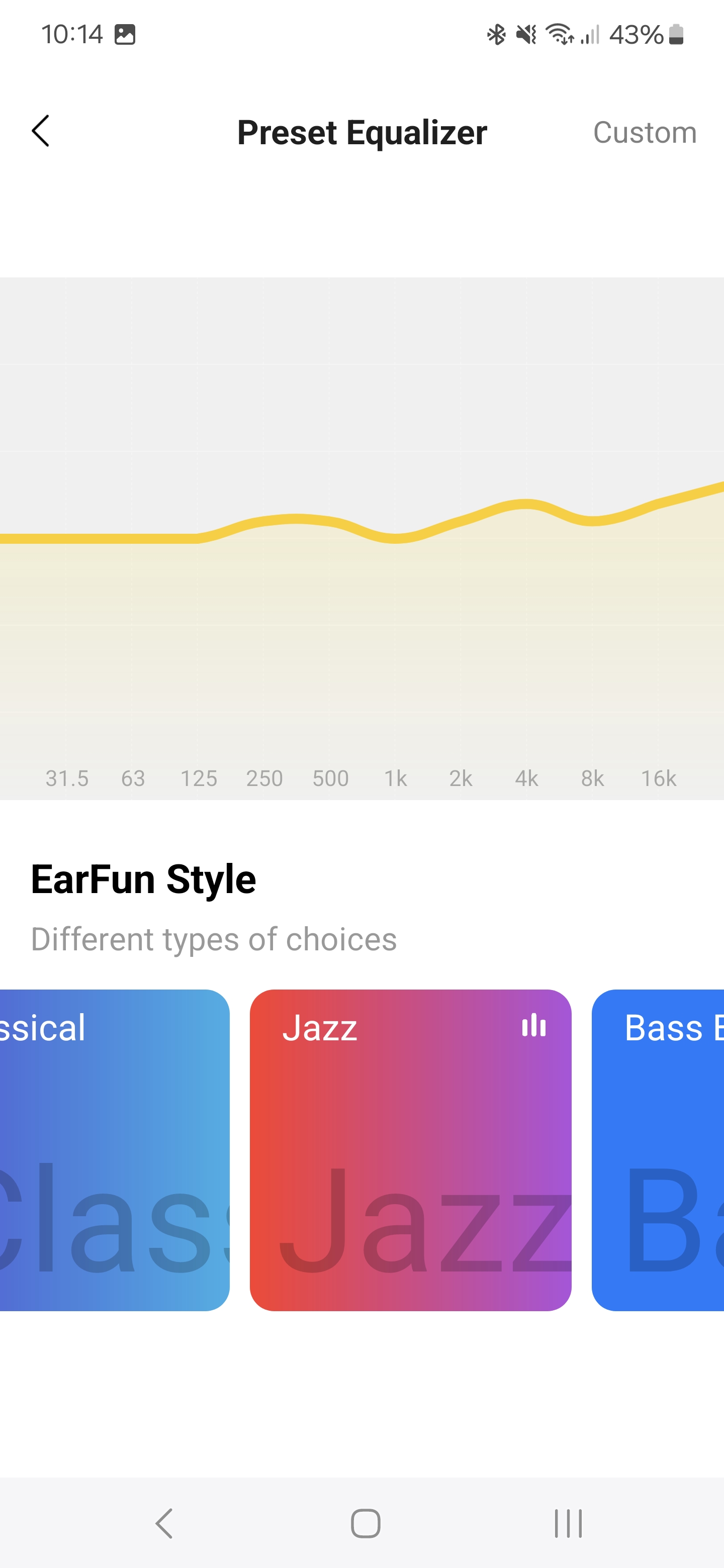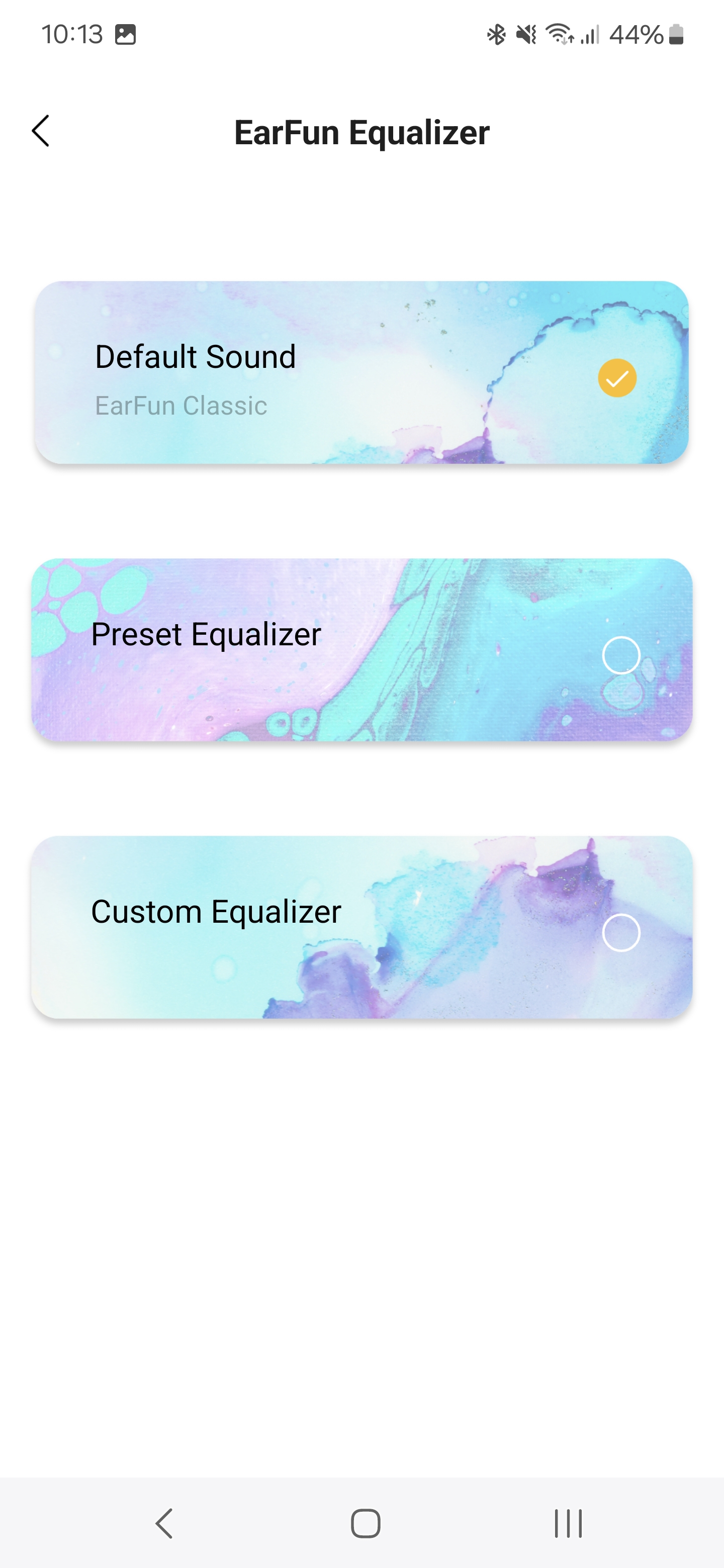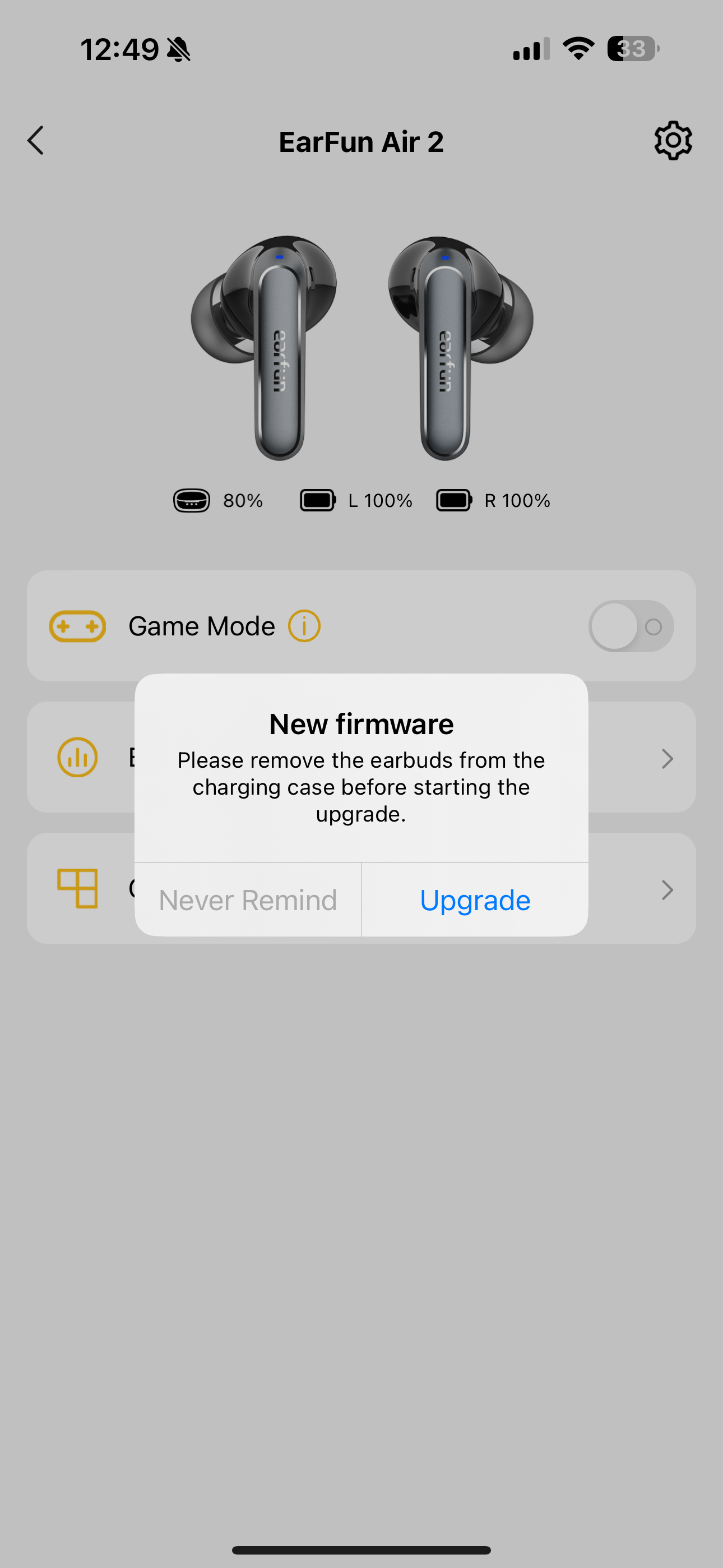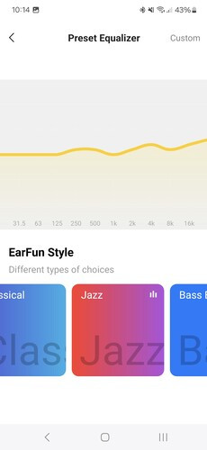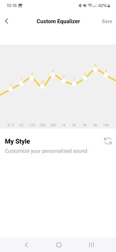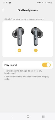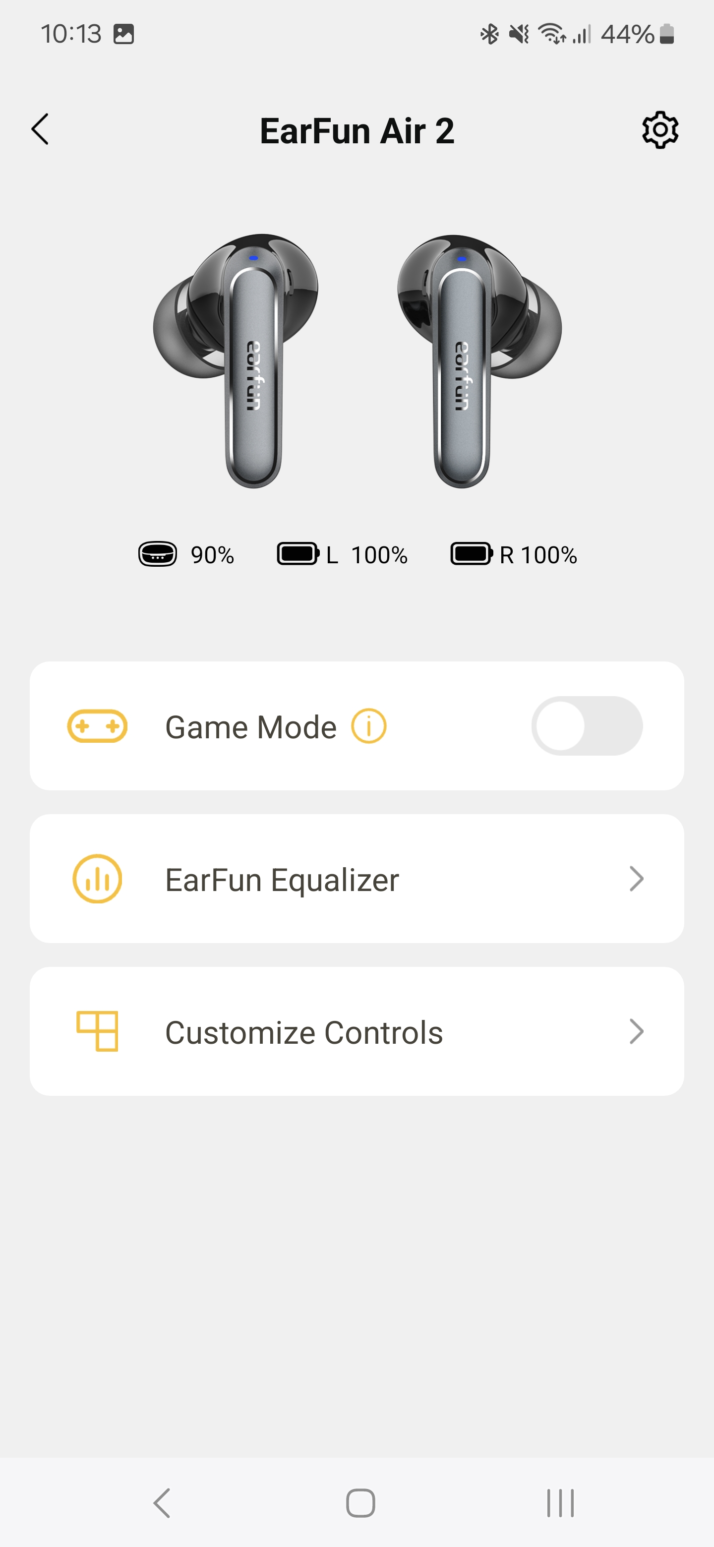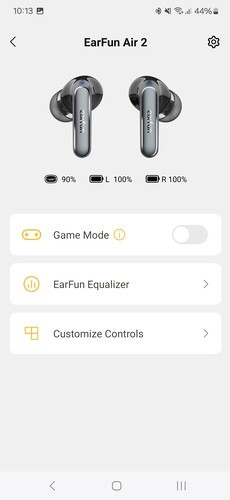 A főképernyőn a fülhallgatók mellett láthatjuk a játék mód kapcsolóját, ez 55 ms-os késleltetést ígér és teljesít is, élvezhetőek maradnak a mobilos multiplayer játékok a fülhallgatón keresztül. Alatta ott a hangszínszabályzó, ami az alapértelmezett beállítás mellett előre programozott, zenei stílusokhoz igazított módokat tartalmaz, illetve egy teljesen saját beállítási lehetőséget. A felhasználó elmentheti egyéni EQ-beállításait, akár többet is.