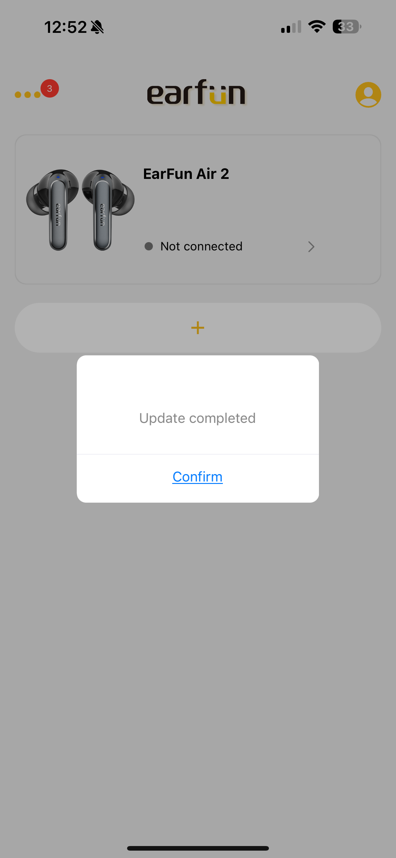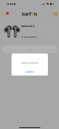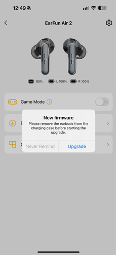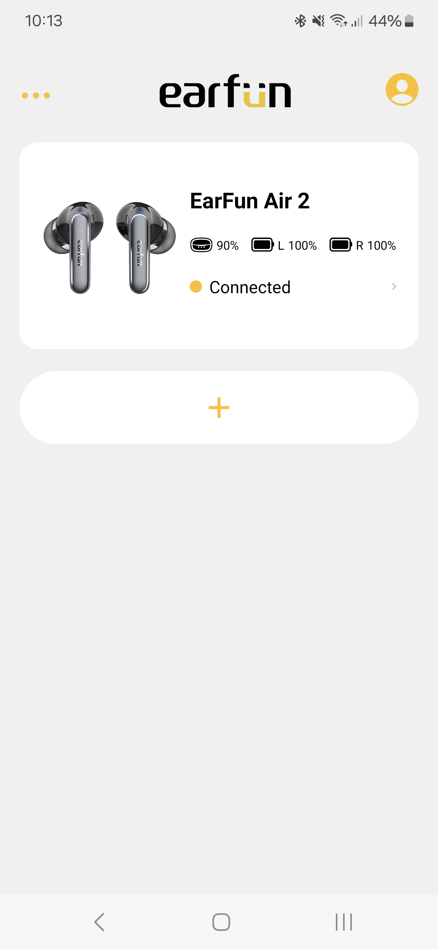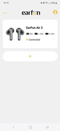 Azon kívül, hogy iPhone-on AAC kodek az egyetlen használható, így kimarad az LDAC a beállítási opciók közül, nincs más különbség az alkalmazásban Android és iOS rendszeren. A többi EarFun termékhez hasonlóan egyből a főoldalon láthatjuk a tok és a fülesek töltöttségét, ha pedig több EarFun cuccunk van, akkor azokat egymás alatt. Balról van egy hírek fül, ahol újdonságokról és frissítésekről vannak információk, jobbra pedig személyes profilt találunk, de ezt nem kötelező regisztrálni. A profil alatt állítható az alkalmazás nyelve, ezek közül az alapértelmezett az angol, de van francia, német, spanyol, két fajta kínai és japán is.