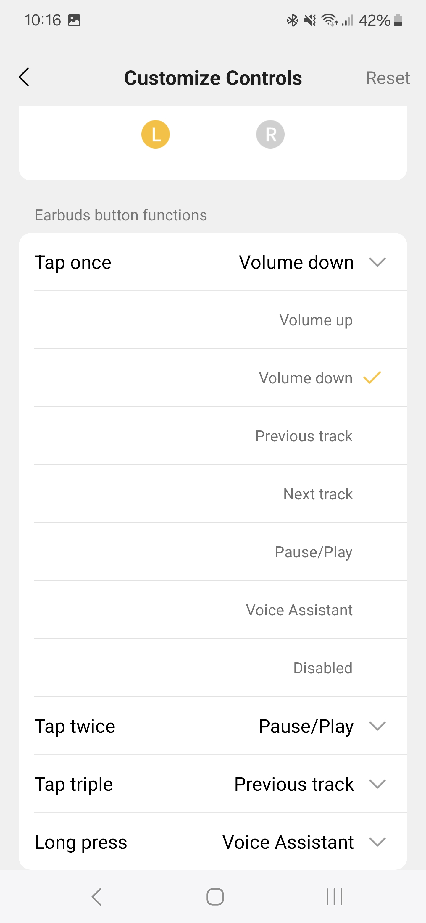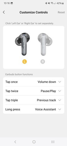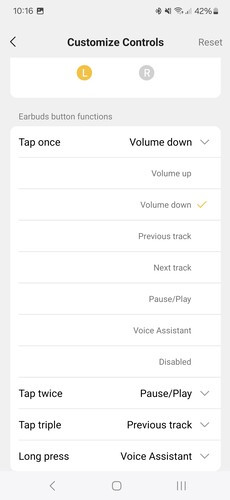 Legalul pedig a fülhallgató érintőfelületének beállításai vannak, itt egy, kettő, három érintésre vagy nyomva tartásra oszthatunk ki igényeink szerint parancsot a jobb és bal fülesen egyaránt. Ezek között ott van a hangerő emelése és csökkentése, a lejátszás léptetése, a telefon személyi asszisztensének felébresztése, valamint a játék mód bekapcsolása. Az érintőfelület érzékenysége jó, időnként talán túlságosan érzékeny is, így az alapértelmezett egyérintéses hangerőemelés és -csökkentés helyett lehet érdemesebb más parancsokat beállítani. Van beépített visszajelzés egyébként, a hangerőt pittyenéssel,a módok közti váltást pedig gépi beszédhanggal jelzi az Air 2.