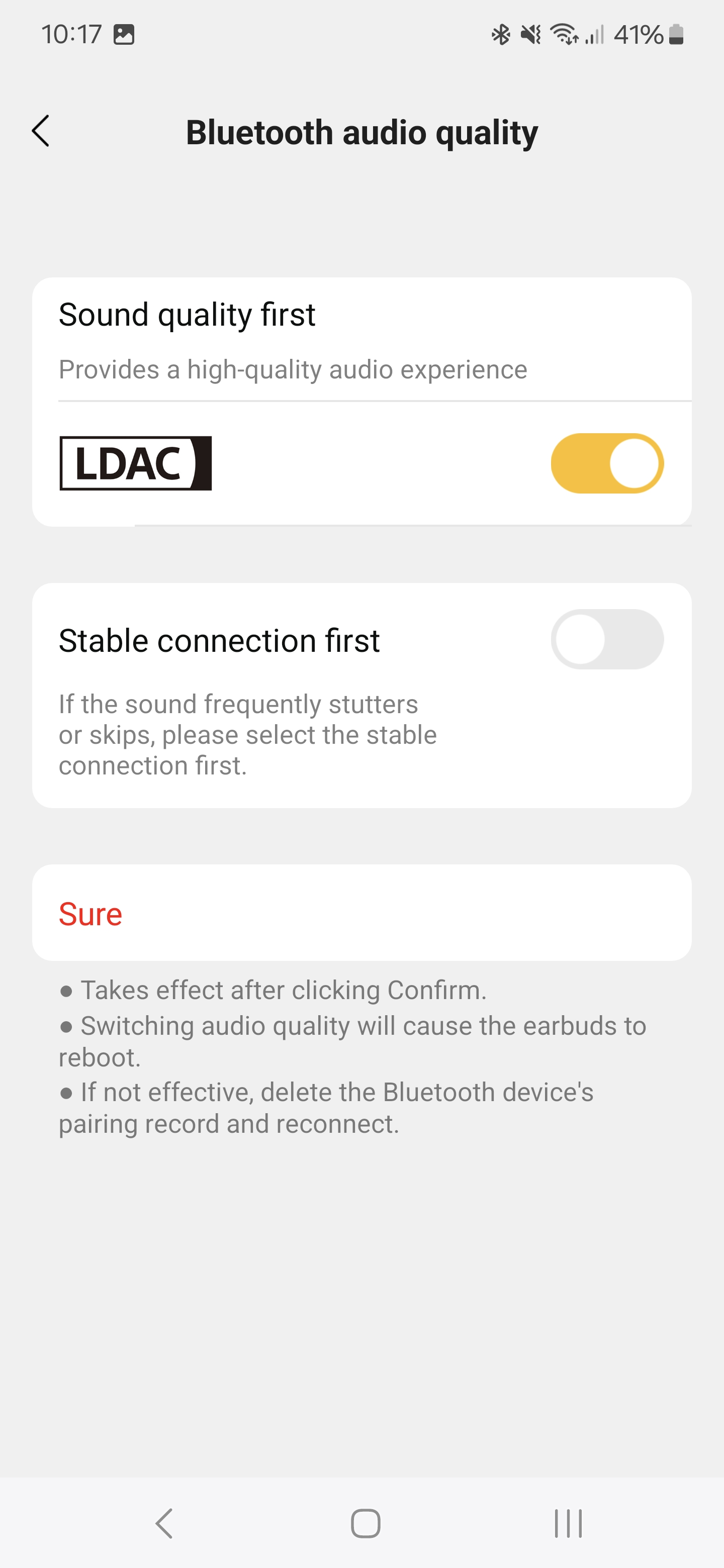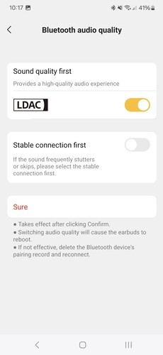 Ezekhez az EarFun Audio appot kell letölteni, ez a Google Play és App Store áruházban is ingyenesen elérhető. Ugyanígy az AAC és SBC kodekek mellett használható LDAC használatát is az alkalmazáson keresztül kapcsolhatjuk be, ilyenkor a füles leválaszt minden forrást és újrakapcsolódik. Bár az alkalmazás arra figyelmeztet, hogy az LDAC kodek aktiválásával nem fog működni a multipont, a gyakorlatban nem okozott problémát az Air 2-nek a kéteszközös kapcsolat fenntartása a nagy felbontású hang beállítása mellett sem, viszont az alkalmazás ilyen esetben elvesztette a fülhallgató jelét az egyik eszközön.