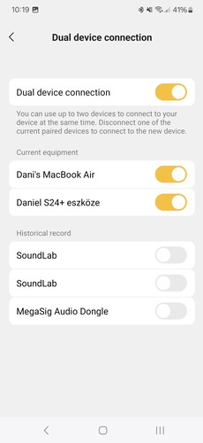 Amint leszedtük a fülhallgatókról a fóliát a töltőbölcső fedelének felnyitását követően, máris párosító módba teszik magukat, ezt pedig a fülesek szárának tetején található LED-ek villogása jelzi. Bluetooth 5.3-at használ az EarFun Air 2, a kapcsolat gyorsan létrejön és stabil (RSSI: -36 dBm), ám a több eszközös multipont használata már nem ilyen egyszerű. A fülhallgató automatikusan mindig az utoljára használt eszközhöz csatlakozik és külön kell kiválasztani a Bluetooth-beállításokban a második forrást. Két eszköz egyidejű kezelésére képes az Air 2, de az EarFun Audio alkalmazásban láthatjuk a régebben használtakat és cserélhetjük a kurrens források egyikét. Egy-egy ilyen váltás minimum 3 másodpercet vesz igénybe és azzal kell kezdeni, hogy kikapcsoljuk a leváltani kívánt forrást az appból. Új eszközökhöz a töltőtok alján található gomb megnyomásával tudunk csatlakozni, de van lehetőségünk a multipont teljes kikapcsolására is.