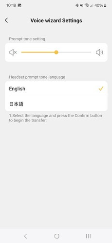Van lehetőség a gépi beszédhang sebességének vagy nyelvének (angol és kínai) állítására, vagy az egész ki is kapcsolható. Találni még elhagyott fülhallgató megkeresésére szolgáló menüpontot, ez magas hangerőn játszik le sípoló hangot az elhagyott füleseken, kapcsolható, hogy melyik mikrofont szeretnénk használni hívások közben, és válthatunk kodeket. Ezeket a funkciókat a fogaskerék ikonnal jelzett menüpont alatt találni, itt vannak a letölthető firmware frissítések is, a teszt alatt mi a 0.75-ös és 0.76-os változatot használtuk.