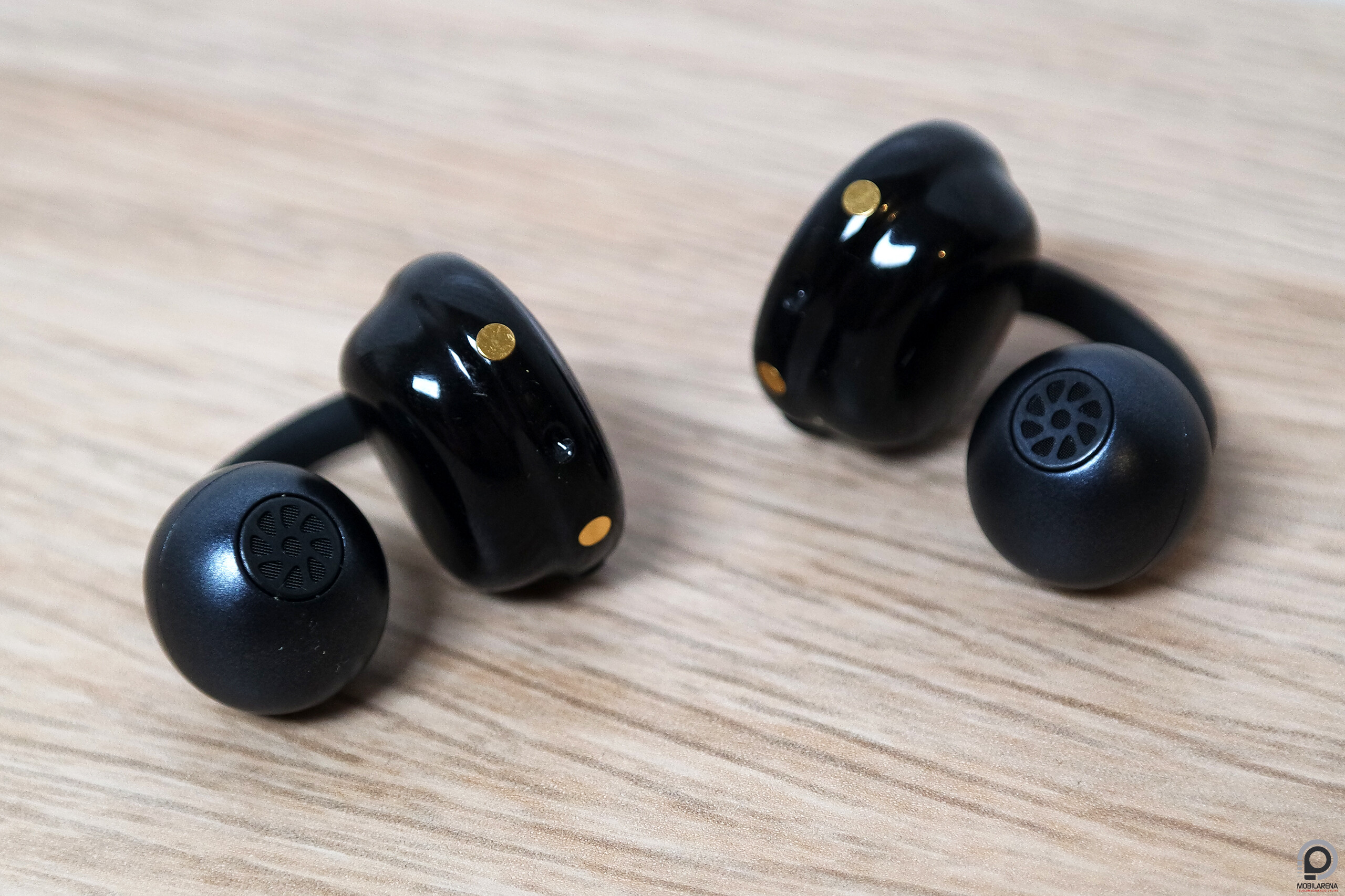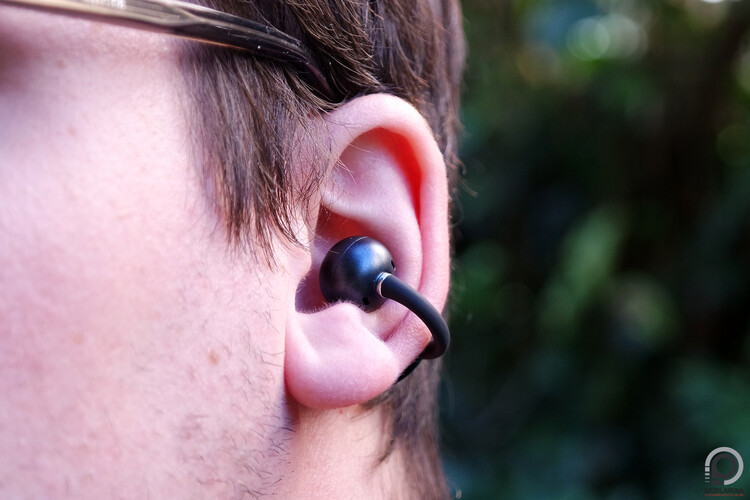 A fülhallgatókon 28 milliméter távolságot mérhetünk a hangsugárzót tartalmazó gömb és a fül mögött ülő rész között, ezt a kettőt nikkel-titán ötvözet tartja össze, szilikon borítással. Így valamennyire flexibilis, az EarFun szerint kétszázezer alkalommal biztosan lehet feszegetni, mielőtt vesztene egyébként feszes tartásából. Számomra a teszt alatt nem jelentett gondot a fülemre felcsíptetni, se onnan levenni a fülest, és hordása közben is erősen tartott, nem mozdult el.