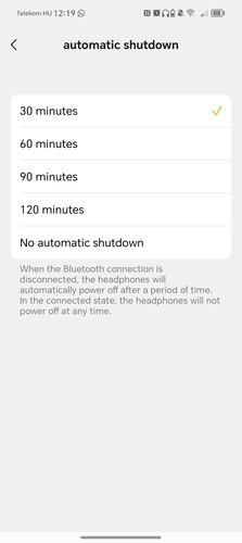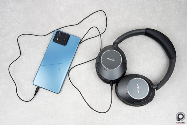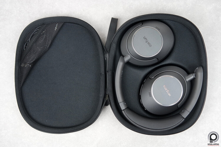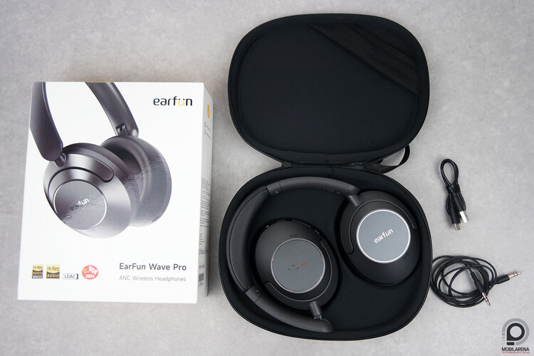 A fedél belső részén egy kis szütyő, ide került az USB-C töltőkábel és az 1,3 méter hosszú 3,5 mm-es analóg kábel, amin keresztül a Wave Pro kikapcsolt állapotban is képes hangot lejátszani. Viszont a fejhallgatóba épített mikrofonok nem működnek analóg kapcsolattal tapasztalataink szerint, ahogy az ANC vagy az egyéni EQ sem, mert amint érzékeli a 3,5 mm-es kábelt a fejhallgató, kikapcsolja magát. Ennek átállítására nincs lehetőségünk az Earfun alkalmazásában, ami kicsit szomorú, az ANC jól jönne vezetékes hangátvitel mellé úgy is, hogy a repülőgépes adapter kimaradt a dobozból.
