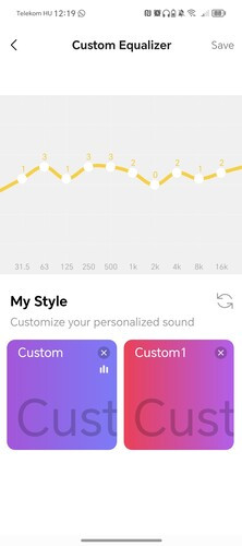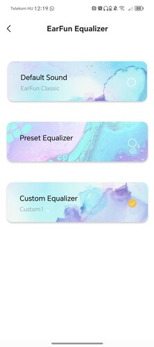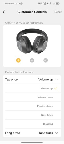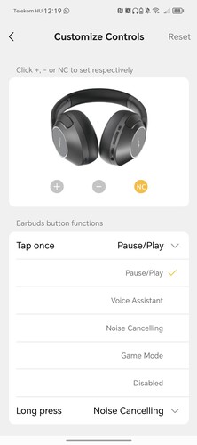 Az NC feliratú ANC gomb alapértelmezetten vált a hangátengedő, normál és zajszűrő módok között egy nyomásra, a hangerőszabályzók pedig a hangerő állítása mellett a lejátszott tartalom léptetésére is jók nyomva tartással. Az Androidra és iOS-re is letölthető Earfun Audio alkalmazásban állítható a hangerőgombok és az ANC feladata, például lehet velük gyorsan kapcsolni a játék módot is, de akár le is tiltható, hogy bármit csináljanak. A bekapcsoló gomb feladatköre nem változtatható, a két másik gomb pedig csak a szimpla nyomást vagy a nyomva tartást képes felismerni, dupla vagy tripla kattintásra nem reagálnak.