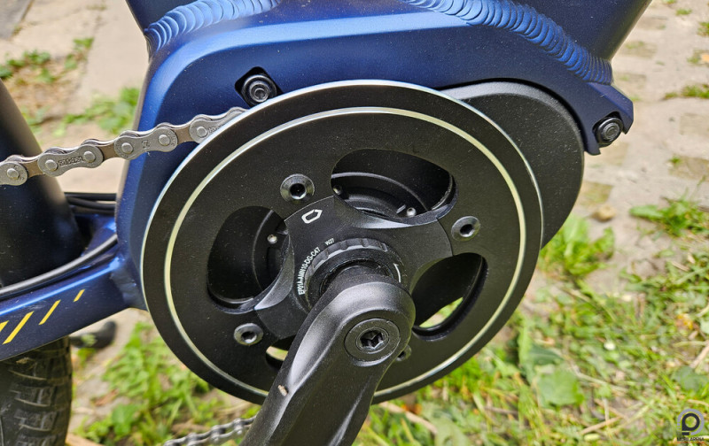A középmotoros megoldás viszont még pedálszenzorral is teljesen más eredményt ad. Egyrészt nincs késés, azonnal változik a teljesítmény annak megfelelően, hogy mennyire tekerünk, ami miatt már-már a nyomatékszenzoros bringák komfortját hozza. Másrészt mivel nincs hátul motor, ezért egyfelől jobb a bringa súlyelosztása, másfelől pedig a hátsó kereket is ki lehet gyorskioldóval szedni egy esetleges defekt esetén. Az Ananda által gyártott motor nem a kereket hajtja, hanem annak az első lánckeréknek a forgásába segít be, amit mi a pedálokkal hajtunk.