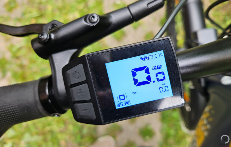 Ez a kis kijelző nem csak az aktuális sebességet, hanem az átlagot és a maximumot is tudja mutatni, a százalékos akkukijelzés viszont ingatag, mivel a pillanatnyi feszültségből számol, ami akár 20%-os eltéréseket is jelenthet. Egy combosabb emelkedő után ijesztően leugrik az érték, hogy aztán öt-hat perc állás, vagy lejtő után megtalálja a helyes számot. Ha az akkut kiszedjük (ehhez kelleni fog a mellékelt kulcs), akkor van rajta egy indikátor, ami kék, sárga és piros fénnyel tájékoztat arról, hogy a töltöttségi szint hányadik harmadánál tartunk. Akárcsak korábban, most is a plusz-mínusz gombok együttes megnyomása visz a szervizmenübe, ahol állítható a kijelző fényereje, a km/mérföld átváltás, a maximálisan elérhető rásegítéses sebesség és a nem használt bringa kikapcsolási ideje.