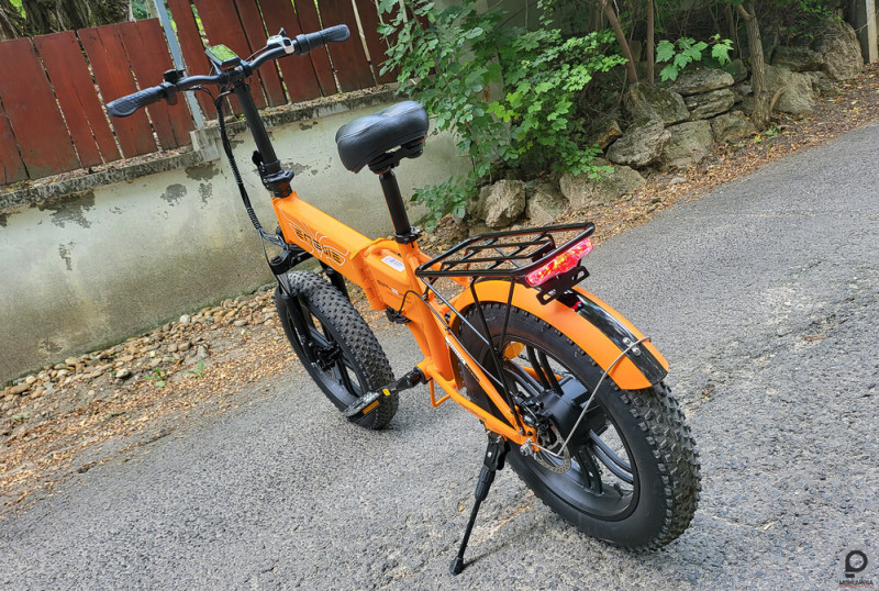Induljunk ki abból, hogy a termék 350-360 ezer forintnak megfelelő összeget képvisel. Aztán ha megnézzük a képeket, akkor hamar rájöhetünk, hogy valahogyan egy minden célra alkalmas bringát akartak összerakni, ami ugyanakkor pont semmire nem alkalmas igazán, bár meg lehet találni a helyét. Vaskos gumik, jó lenne földútra, homokra, van rajta sárhányó, de még csomagtartót is kapunk, az ülés pedig széles és puha. Városban a széles gumi nem okvetlenül ideális, ha nekünk kell pedálozni, de itt megoldja az elektromotor és a töredezett aszfalton segít a komfortérzet kapcsán (pláne ha nem fújjuk kőkeményre a gumikat), terepezni viszont kicsit kreténség csomagtartóval és egyéb tömegnövelő izékkel, a bringa ugyanis 30 kilogrammot nyom. Össze is lehet csukni (olyan nyikorgással történt ez meg, hogy az már ijesztő volt), még egy kis támaszt is raktak lentre, hogy azon álljon meg a kettéhajtott eszköz, de ki az az izomtibor, aki ezt a 30 kilós, nyeklő-nyakló csomagot szívesen beemeli egy tetszőleges SUV hátuljába? Szóval valahogy nem áll össze a koncepció és a célcsoport, de hát ez legyen a legnagyobb baja, ha egyébként egy tisztességesen összerakott és működő szerkezet. Csak hát…