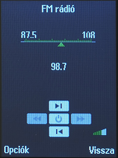 A zenelejátszó eredetileg a felfelé mutató gyorsgombhoz van rendelve, mint említettük, nem húzza be az albumokat, így a fájlkezelőből kell megszólaltatni a muzsikát, ezzel lemondva a grafikus felületről, ahol egyébként beállíthatnánk lejátszási listát, vagy generáltathatnánk a programmal, kérhetnénk ismétlést és a számok keverését is, valamint opcionálisan engedélyezhetnénk a lejátszó a háttérben való futását. Kivéve, ha megint visszanyúlunk régi emlékeinkhez és létrehozzuk a My Music mappát a memóriakártyán, onnan valamiért hajlandó beolvasni a fájlokat a dedikált alkalmazásfelület is. A program MP3-mal kompatibilis, ezeket viszont csengőhangnak is beállíthatjuk (amit az akkumulátort kivéve mondjuk rendre el is felejt). A multimédiás hangszóró nem szól jól, cserébe asztalra helyezve is irtó hangos, annak ellenére, hogy a hátlapon dőlnek belőle a decibelek, de alapvetően nem multimédiás eszközről van szó, ennek függvényében pedig nem is rossz. Bejövő hívást és értesítést még akkor is meg fogunk hallani, ha közvetlenül mellettünk flexelnek. További jó hír, hogy az FM-rádió nem maradt ki, a mellékelt fülhallgatóval rádiózhatunk, de kihangosítva is működik a dolog. A beállításokban választhatunk, hogy az audió minősége sürgős vagy nem sürgős legyen-e, ennél viszont fontosabb, hogy az adást az általunk választott tárhelyre menthetjük, valamint a háttérbe is küldhetjük az alkalmazást, ekkor az aktuális adó neve a főképernyőn látható. Amennyiben elnevezzük, RDS ugyanis nincs. A hangzás fülesen keresztül kissé digitális, némiképp zúg, vagyis inkább nagyon, az audiotartalom üres és mélységet nélkülöző minőségben szól. Egyébként rádiót hallgatni háttérzaj vagy informálódás céljából teljesen használható, mind a hangszóró, mind a hagyományos kialakítású fülhallgató.