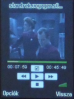 Videót nézni maximum VGA felbontásban tudunk, kezelőeszközökkel vagy teljes képernyőn, ezen kívül az ismétlést tudjuk beállítani. A 3gp és AVI formátumokat kezeli, ugyanakkor a lejátszóból, a zenelejátszóhoz hasonlóan nem hajlandó megnyitni a memóriakártyán tárolt tartalmakat, mindenképpen a fájlkezelőből kell indítványoznunk a műveletet. Nem a mapparendszer zavarja össze, ha a tároló gyökerébe másoljuk a fájlokat, akkor is a kezelőből kell előhalászni őket. Ezt egyetlen módon tudjuk elkerülni (és ebben nem ad támpontot a telefon által használt saját fájlstruktúra sem), ha a My Video könyvtárat létrehozzuk. Ha éppen a kanadai rengetegben küzdünk egy mamutfenyővel, de nem akarunk lemaradni csemeténk első lépéseiről, akkor kiválóan használható a funkció, egyébként ne ezen álljunk neki a Gyűrűk ura trilógia rendezői változatának. Videót felvenni 3gp formátumban tudunk, 320x240 negyed VGA felbontásban, a link alatti minőségben.