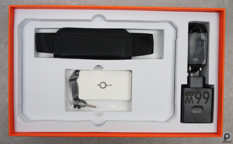 A nem csúcskategóriás vonalon mozgó gyártók jól mérték fel, hogy a piac felső szegmensét nem tudják uralni (pláne nem az ismertebb brandekkel szemben), ezért az összes felsorolt szereplő arra törekszik, hogy kínáljon egy használható, de nagyon ellenálló masinát, és mindenki próbál egy-két extrával kitűnni a mezőnyből, a Fossibot DT2 például a csomagolásával már nyert nálunk egy pirospontot. A jólláthatósági-mellény színvilágú dobozban ugyanis nem csak a több mint 1 kilogramm(!) tömegű termék lakik, hanem jár mellé 66 wattos PD töltőfej mindkét végén Type-C végződésű kábellel, valamint egy nyomokban bőrt is tartalmazó szíj, amit a dobozban szintén megtalálható fém kampók felcsavarozása után tudunk ráhurkolni a tablet hátára, hogy egy kézzel meg tudjuk azt terepen tartani, miközben a másik kezünkkel matatunk a kijelzőn.