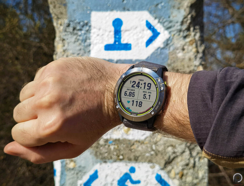 Szuper, hogy a GPS módtól kezdve a megjelenítendő és mért edzésadatokig az órán minden testreszabható, hegyi túra esetében átlagos tempó és mozgástempó mellett a sebességre, a terhelésre, az aerób és az anaerób edzéshatásra is kapunk információt, plusz az óra hőmérője is statisztikáz, bár izzadt csukló felett rendre magasabb értéket mutat a kinti hőmérsékletnél. Még elégetett kalória és kiizzadt folyadékmérés is jár, plusz ahány sportféle, annyi extra statisztika. Viszont hiányolom az órából a Garmin térképeket, ha már ennyire az extrém távokra és expedíciókra rendezkedett be hosszú üzemidejével és szívós küllemével. Vaktérkép persze jár, akárcsak pofonegyszerű navigációs opciók akár előre mentett vagy korábbi útvonalon, de mégis csak az Enduro profiljába illett volna, ha látom a kitűnő transzflektív kijelzőn a jó magyar ösvényeket és a szintkülönbségeket, bár legalább szintemelkedésre lehet edzéstervet készíteni.