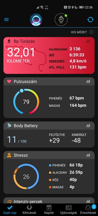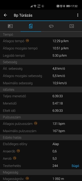 A hívásfogadás mikrofon híján nem opció, akad viszont jó pár alapvető óralap, másokat pedig a Connect IQ alkalmazással tudunk beszerezni. Amúgy mindkét Garmin app rendben futott HMS-es telefonon, csak a Google Térkép nem jelent meg az edzésútvonalakat visszanézni, de az online Connect felületre lépve ez is meglett. A Garmin ráadásul számos futóappal és szolgáltatással összedolgozik, valamint felkínálja a GPX fájlok exportját. Ezt a túrák után ki is használom: máris importálom az állományokat a Locus Mapsbe.