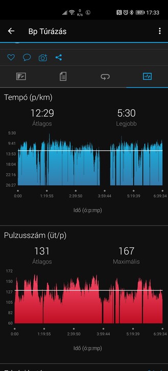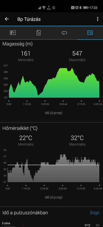 Elliptikus tréner során a két csuklóék 1-2%-os határon belül mérte az elégetett kalóriákat és a maximális, illetve az átlagos pulzusszámot, a Garmin cuccok egyébként is megbízhatóak ezen a téren. Az Enduro ráadásul a Huawei-nél 20-30 másodperccel hamarabb jelezte, ha megugrott a pulzusszámom, így HIIT és hasonló edzésekre alkalmasabb – főleg, mivel még precízebb pulzuspánt társítható mellé. Elmentem egy hegyi túrára is: a Locus Maps a Turistautak.hu adatbázisát használva 32,25 km-t mért 1030 méter szintemelkedéssel, a Huawei kütyü 32,93 km-t számolt 1085,6 méterrel, az Enduro pedig 32 kilométert, 1091 méterrel. A GPS-es nyomvonal követés tehát kellően pontos, ezt a túra Locusba történő importálása után is meg tudom erősíteni, az óra által mért magasságon pedig, ami szintén közel járt a valóshoz, a Garmin saját adatbázisból tud még egy kicsit pontosítani.