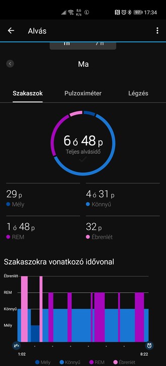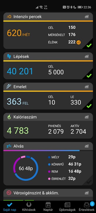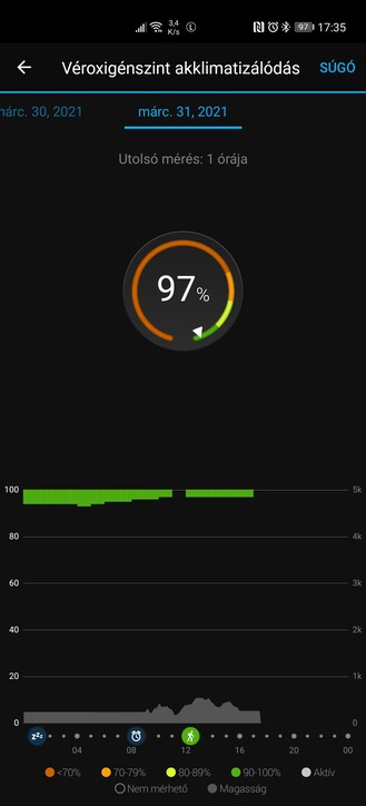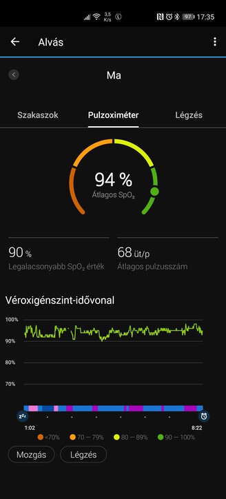 Az óra mindenféle menüje és beállítása bővíthető és paraméterezhető, én például elég hamar váltani szoktam intelligens helyett másodpercalapú adatrögzítésre a pontosság kedvéért, és ahogy jeleztem: a fennálló helyzetben a véroxigén-telítettség mérést is aktiválom, ha opció. Az Enduro mondjuk nem túl előnyös, 94-97% közötti átlagokat mért, míg a Watch GT 2 Pro 97-99% közé lőtte be a napi átlagértékeket és pillanatnyi méréseket, és mivel remek edzésállapotban vagyok tünetmentesen, biztos, hogy az utóbbi óra a pontosabb.