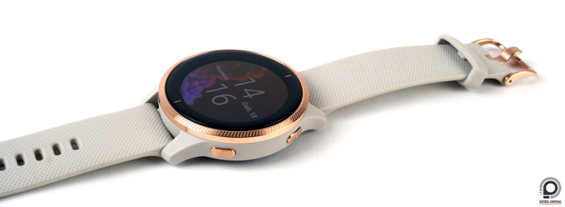 A kialakítás nagyon hasonló a Vivoactive szériához, de a rozsdamentes acélkeret rovátkolt mintázatot kapott. A Venu egyféle méretben, 43 milliméteres átmérővel érhető el, ebből a színes, érintésérzékeny, 390 x 390 pixel felbontású, 1,2 hüvelykes kijelző tényleges átmérője 30 milliméter. A 43,2 x 43,2 x 12 milliméteres tokozás a Garmintól megszokott polimer törtfehér/rozé arany, fekete/arany, gárint kék/ezüst vagy fekete/ezüst színben. Én a lányos színváltozatot kaptam, ami a rose gold részletek (csat, fém vezérlőgombok és keret) ellenére is igen szolid, noha kissé nagynak és valamelyest nehéznek érzem (46,3 gramm).
