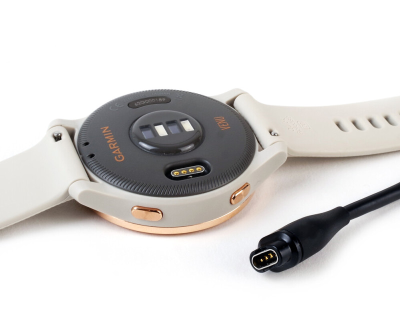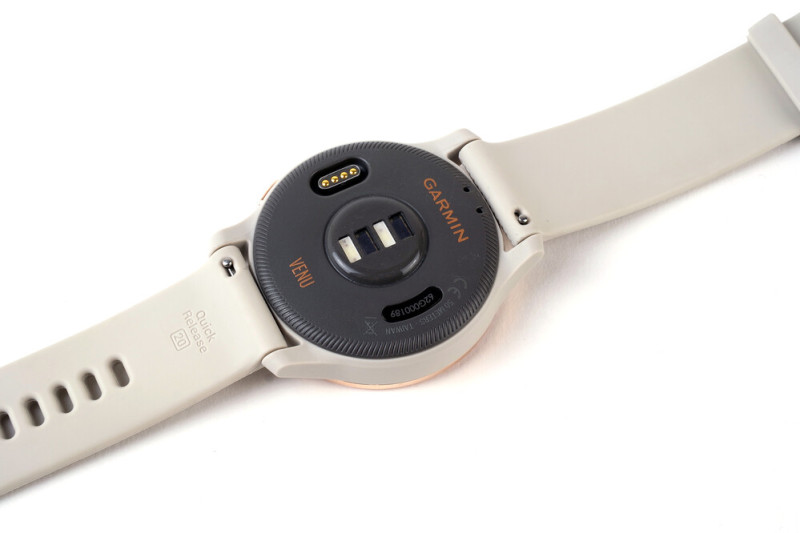 A készüléktest hátulján optikai szenzorokat és egyedi töltőcsatlakozót találunk, amihez mellékeltek egy hagyományos USB kábelben végződő töltőkábelt. A négypines érzékelőfelület mélyedésben ül, így nincs szükség mágnesre vagy dokkolóra a töltéshez, mindössze csatlakoztatni kell a kompatibilis kialakítású kábelt, ráadásul tetszőleges irányból, mivel szimmetrikus. A Garmin és a Venu felirat közé pedig nem csak pulzusszenzor, de véroxigénszint mérő is került. Hangszóró vagy mikrofon nincs, 5 ATM nyomástűrés és víz- illetve porállóság viszont igen.