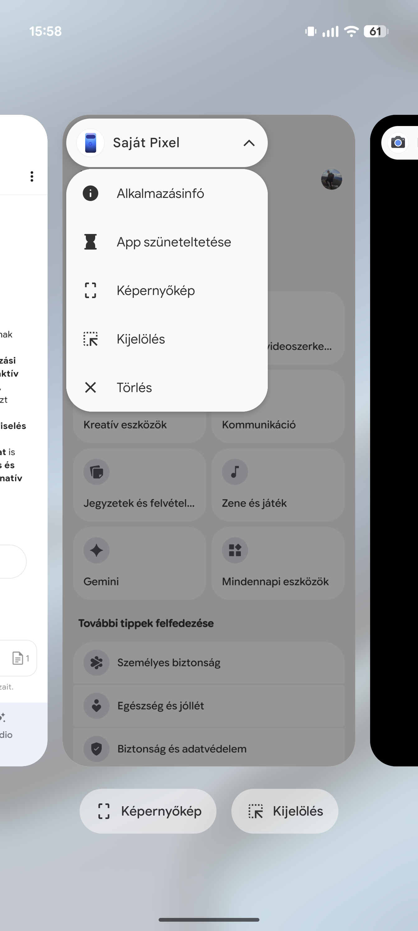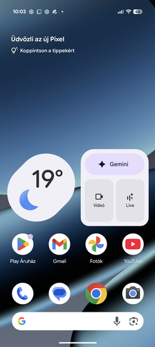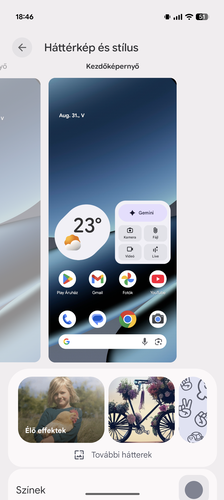 A főképernyőn kisebb lett az Áttekintés (At a glance) widget, így végre egy sorral több ikont lehet kipakolni. Vannak új háttérképek, illetve új háttérkép szerkesztési opciók is. Ezeket az Effektusok menüpont alatt találjuk, legjobban olyan képekkel működik, amin emberi arcot vagy állatot észlel a rendszer, ezek köré lehet formákat kitenni. Beállítható az is, hogy az aktuális időjáráshoz passzoló animációt játszon le a Pixel a háttérképen, és olyan is van, hogy 3D-s effektet adjon a képhez. Természetesen maradt az AI háttérkép-generátor meghatározott promptokból való választási lehetőségekkel. Ezek egy része érkezik a korábbi Pixel telefonokra is egyébként frissítéssel.