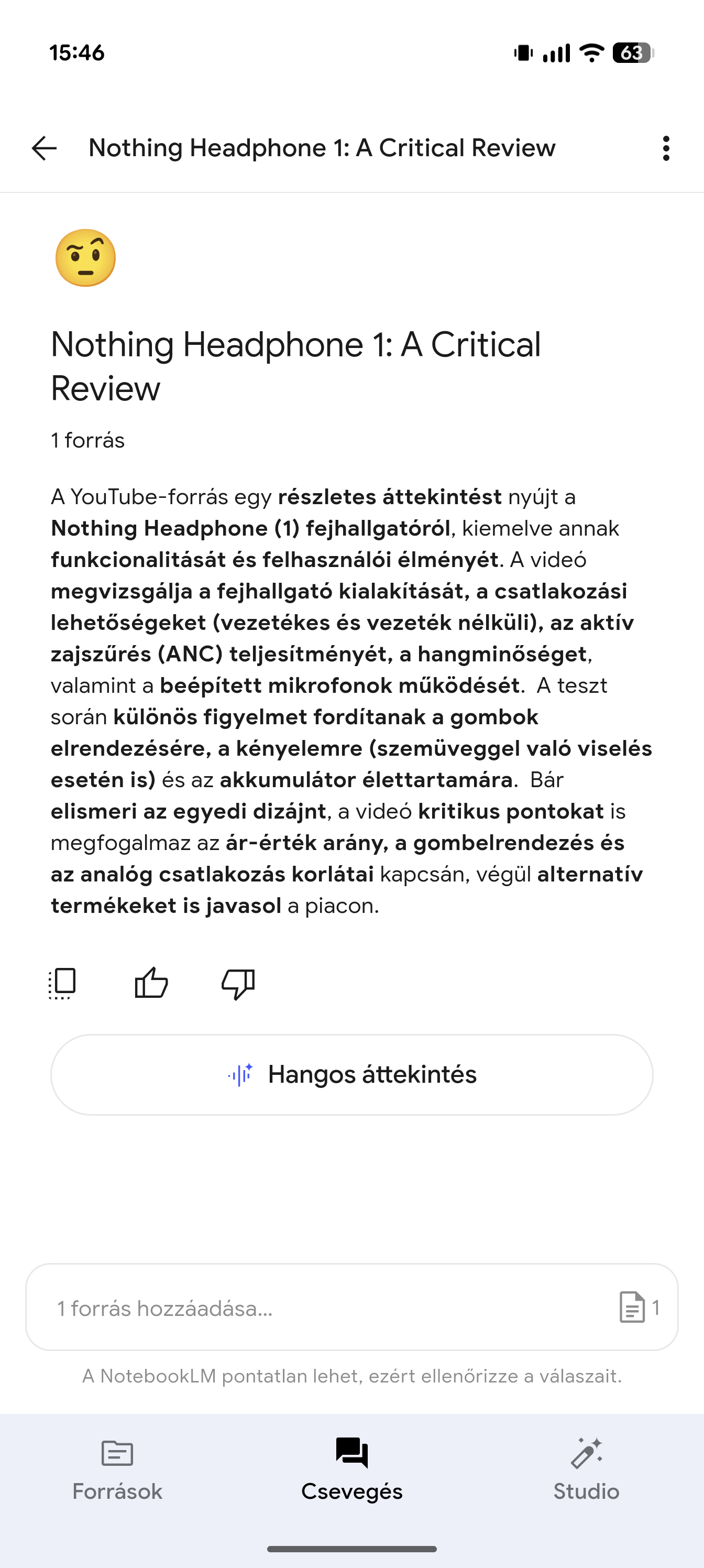A NotebookLM a Google által fejlesztett AI alapú kutatási- és jegyzet-asszisztens alkalmazás, dokumentumok, weboldalak, de akár YouTube videók is bedobhatók belé, azokat elemzi, és a lényeget röviden összefoglalva leírja vagy felolvassa. Nagyon durván jól működik magyarul, belinkeltem a Nothing Headphone (1)-ről szóló videónkat, másodpercek alatt összeszedte írásban pontosan, hogy mikről volt szó benne, és ezt követően a Studio funkcióval csinált a 25 perces videóból egy 19 perces (!) podcast beszélgetést, amiben egy AI generálta női hang és egy szintén AI generálta férfi hang párbeszédes formában dumált arról, amiket én egyedül elmondtam a kamerának. Félelmetes. Ami pozitív, hogy meg lehet osztani a Google Workspace részeként másokkal is jegyzetfüzeteinket, és támogatott a valós idejű együttműködés, az is pozitív, hogy elvileg a feltöltött adatok, dokumentumok privátak maradnak, új AI modellek tréningelésére nem fogja őket felhasználni a Google.
