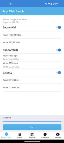| Random Write | 232 MB/s | n/a | 156,89 MB/s | 358,58 MB/s | 563,97 MB/s | 558,87 MB/s |