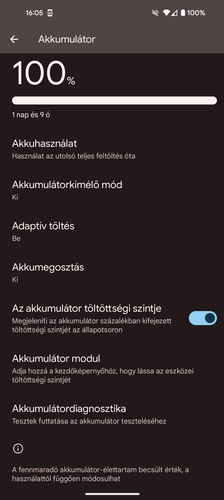 Tölteni 30 wattal lehet a készüléket vezetéken keresztül, vezeték nélkül pedig akár 23 wattal, ha valahonnan megtesszük a második generációs Pixel Stand töltőt. A normál Qi töltőkről vezeték nélkül maximum 12 wattot vesz fel a telefon, leadni pedig 5 wattal tud a hátlapon át. A beépített 5050 mAh-s akkumulátor teljes töltése másfél órát vesz igénybe, lemeríteni pedig 10-11 órányi aktív képernyő-használattal fogjuk tudni. A beállítások között van akkukímélő mód, van alkalmazkodó töltés és vannak beépített szoftveres tesztek arra az estre, ha hibás aksira gyanakodnánk. Melegedést töltés közben csak akkor tapasztaltunk, amikor a Pixelt használtuk energia megosztására, de elhanyagolható volt a mértéke ennek is.