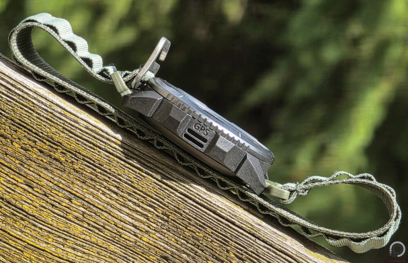 A recézett, de nem tekerhető titánkeret túloldalán a szem még két gombot várna, helyettük viszont csak mikrofon és hangszóró van a Bluetooth hívásfogásáshoz, illetve a hangos jelzésekhez, plusz GPS felirat. A GNSS modul amúgy kétcsatornás a konstellációk részletezése nélkül, az óra hamar talál odakint jelet. Alul mikrofon van, felül pedig a legjobb Garmin funkció lemásolása: a négy fehér és egy vörös állásban világító zseblámpa, pontosan a Forerunner 970 fényerejével.