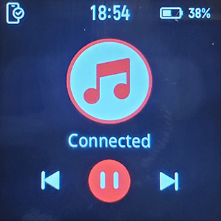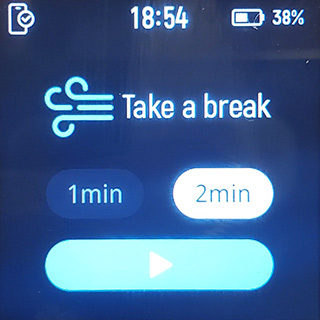 A következő menüpontunk a zenevezérlés (előre, hátra, play/pause), aztán jön a “more” feliratú ikon, ami mögött van még stopper, visszaszámláló, telefonkereső és légzési gyakorlat (amolyan relaxációs izé egy, vagy kettő perc hosszan). Még van settings néven egy-két apróság, de a vertikális menürendszert ezzel megtárgyaltuk. Oldalra haladva a számlapról csak ugyanolyan funkciók közé jutunk, amiket már ismertettünk (aktivitási stat, pulzus, alvás stat, légzésgyarkorlat és időjárás), szóval elmondható, hogy funkcionálisan a két óra tényleg ugyanaz. Az is elmondható, hogy nincs döcögés, megtorpanás és alapvetően elég egyértelmű a rendszer logikája, nem fordult elő félrenyomás.