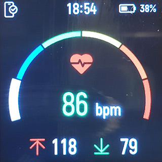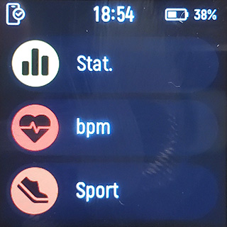 A stat nevű menüpontban az aktivitásunk látszik, de csak a lépések száma, a megtett kilométerek és ez elégetett kalóriák vannak itt az aktuális nap kapcsán. Ennél több nincs, sem grafikon, sem a korábbi napok adatai nem látszanak itt. A második menüpont a pulzus, itt nem kell sokat magyarázni, de az jópofa, hogy egy fordulatszámmérőhöz hasonló grafika mutatja, hogy mennyire kell aggódni. A két óra kis hibahatárral ugyanazt mérte, szóval ezzel nincs gond.