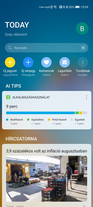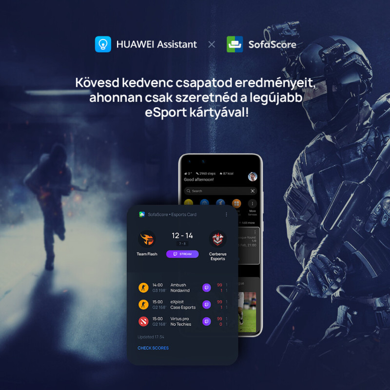 A főoldaltól balra a Huawei Assistant híroldala gyűjti egybe a friss tartalmakat és érdekességeket, illetve az EMUI tippeket. Ugyanide ikonokat, jegyzeteket, névjegyeket és egy rakás widgetet dobálhatunk. 2021 márciusától pedig az asszisztensbe integrálva megjelennek a világ sport és e-sport eredményei. Az Assistant főoldalra dobható kártya a népszerű és az AppGalleryben elérhető SofaScore algoritmusát használja, de a lényeg éppen az, hogy nem szükséges azt megnyitni az alkalmazást friss eredmények megtekintéséhez.