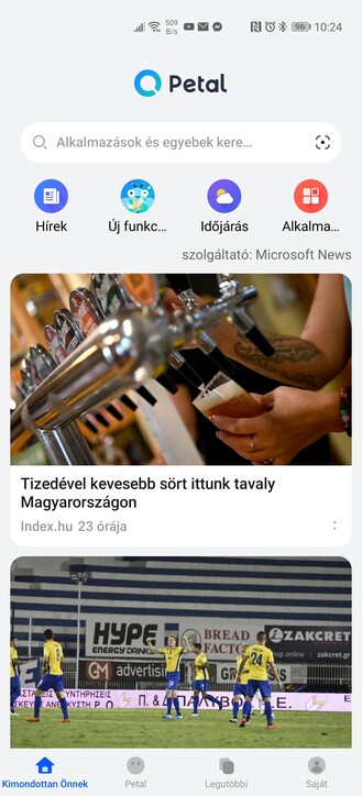 A Petal Search a HMS ökoszisztéma legdinamikusabban fejlődő szolgáltatása, melynek sávjára vagy ikonjára bökve, kifejezetten önnek néven ugrik fel a Petal kezdőoldala, rajta a Microsoft News által válogatott, friss hírekkel. Felül az új funkciók bemutatása ikonra is bökhetünk, mellette az időjárásra, és az alkalmazások fülre, az utóbbi pedig mindjárt ajánl egy csomó olyat, amelyik a Huawei telefonok alapvető alkalmazásboltban, az AppGalleryben még nem érhető el – ilyen a Facebook vagy a Messenger.
