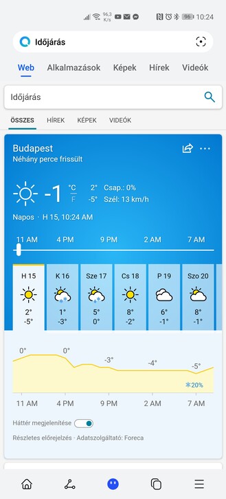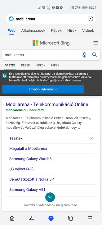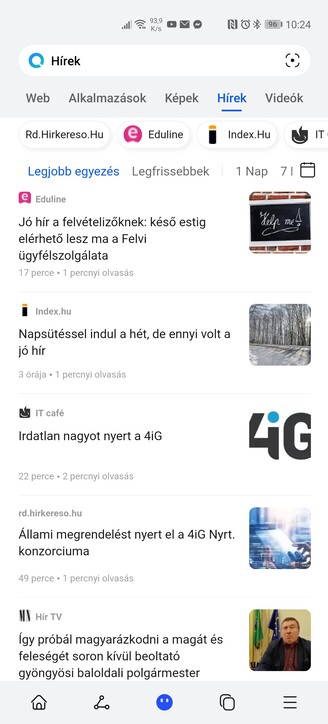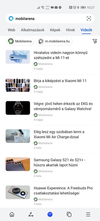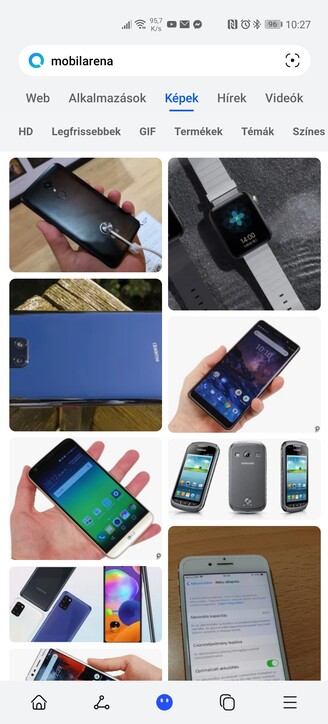 A keresőbe tehát bármit beírhatunk, és az alkalmazások fül mellett webes találatokat is kaphatunk linkekkel, képekkel, hírekkel és videókkal, a Microsoft Bing motorja segítségével. A találatokat a megfelelő alsó ikonra bökve mindjárt megoszthatjuk, plusz gyorsan szétnézhetünk legutóbbi kereséseink között. A Petal Search képalapú keresésre is alkalmas a kamera segítségével, a keresősáv jobb szélén lévő ikonra bökve.