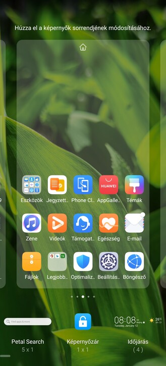 A leghasznosabb elem a főoldalon a Petal Search rendszerszintű kereső és tartalomajánló minialkalmazása – ez egy fehér sáv formájában pillantható meg legfelül. Ha mégse lenne ott, két ujjunkat a képernyőn összecsíptetve tudjuk kiválasztani alul a minialkalmazásokra bökve. Itt hosszan kell rányomni a Petal Search opcióra, majd ujjunk felemelése nélkül a keresősávot a főoldalra húzni.