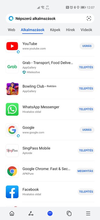 A keresősávra bökve és kedvenc alkalmazásunk nevét beírva olyanra is akadhatunk, amelyik jelen van az AppGalleryben (Asphalt 9) vagy a fejlesztő honlapjáról közvetlenül tölthető le (WhatsApp), esetleg gyorsalkalmazás vagy internetes link formájában a Böngészőben nyílik meg (Google Naptár) – így vagy úgy, a Petal Search hatékonyan eljuttat minket a célig. Amennyiben a telepítés opcióra bökünk, a Petal néhány engedély megadása után a megfelelő oldalra navigál bennünket, és vagy mindjárt megkérdezi, hogy elindítsa-e a passzoló APK telepítőfájl letöltését, vagy magunknak a letöltés, esetleg download opcióra bökni, hogy elinduljon. Amint az APK fájl lejött és ráböktünk, engedélyezni kell a Petal Search számára, hogy telepíthessen külső forrásból beszerzett alkalmazásokat, és ezt mindjárt meg is teszi – így lehet könnyedén beszerezni mondjuk a Chrome-ot vagy a Google Mapst azon Google alkalmazások közül, amelyek elindulnak HMS-es telefonon – erre a témakörre egy egész oldalt szenteltünk.