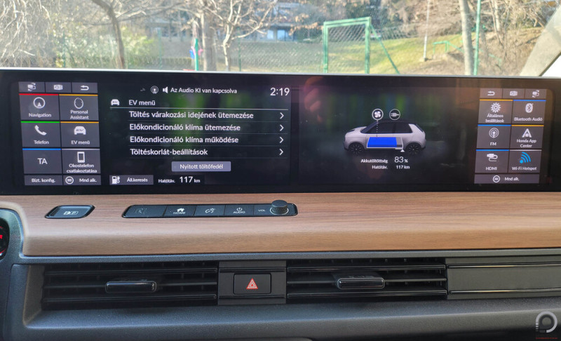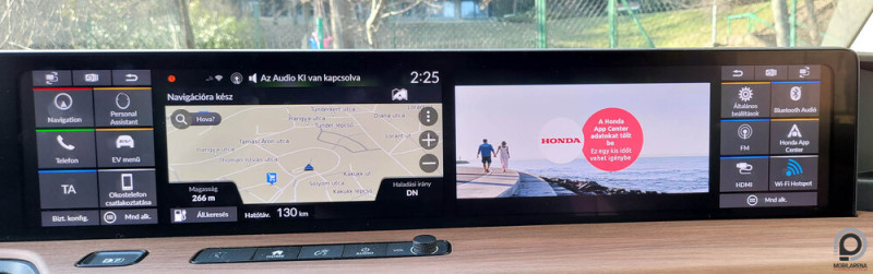 Az Android Auto csak kábellel működik, a CarPlay megy vezeték nélkül is. A gyári navigáció fabatkát sem ér, de ez nem óriási meglepetés, régen lehagyták a mobilos megoldások azt a szintet frissességben, tervezésben, online információkkal, amit a beépített opciók képesek hozni, szerencsére a Hondánál meg tudták oldani, hogy a Waze utasításait a vezető előtti kijelzőre is ki lehet tenni, nem csak a gyári navi tud arrafelé kommunikálni.