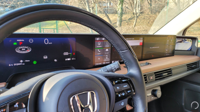 A Honda e fedélzeti rendszere merőben más, mint bármilyen autó hasonló megoldása. Láthatóan nem keveset foglalkoztak vele, aminek tényleg egy egészen zseniális eredménye született, de maradtak benne kiaknázatlan lehetőségek és pár ostobaság is előfordul, de összességében azért nagyon előremutató. Egy Android alapú megoldásról van szó, ami alapvetően két kijelzőn dolgozik, a vezető előtti, harmadik panel külön üzemel.