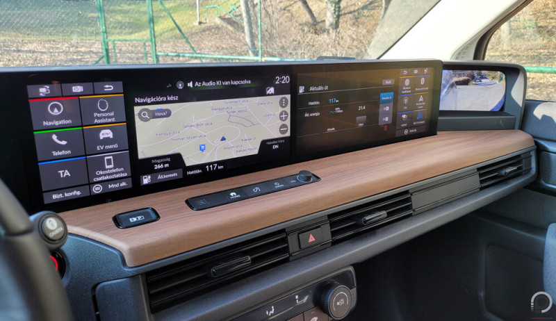 A másik két kijelzőn terpeszkedik a tényleges fedélzeti rendszer, alapesetben egy választható háttérkép tölti ki, de a két kijelzőre egy csomó funkciót kitehetünk egymástól függetlenül is. Nálam az vált be, amikor a hozzám közelebbi ablakban az Android Auto (és a Waze) futott, a távolabbiban pedig a hajtáslánc működését láttam (hatótáv, visszatöltés). De ki lehet tenni a zenelejátszót, a HDMI-n érkező jelet, a telefonos felületet is simán, plusz anélkül lehet babrálni a beállítások között, hogy közben eltűnne az Apple CarPlay, ráadásul tetszés szerint meg lehet cserélni a tartalmat a két kijelző között.