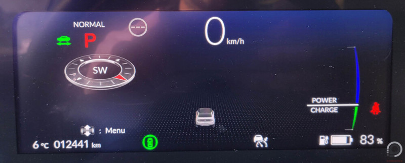 Ami a kormány mögött van, az kevésbé tűnik vizuálisan átgondoltnak, kicsit mintha koncepció nélkül kerültek volna rá az információk, vagy inkább amiatt tűnik szegényesebbnek, hogy ezek nincsenek egymástól elkülönítve, de igazából minden fontos dolog leolvasható innen, még ha a kormány karimája a nekem kényelmes magasságban pont bele is lógott az aktuális sebesség kiírásába, HUD pedig nincs. Balra lehet információkat kitenni (navigáció, audió, telefon, hatótáv stb.), jobbra van a töltés-visszatáplálás skálája, közepén pedig ott a mi kis Hondánk hátulról és megy az úton, látjuk, hogy a radar szerint milyen messze van az előttünk levő autó, plusz felrajzolja a sávok szélét is, ha látja. De nem ez a tutiság, hanem hogy minden úgy világít rajta, ahogyan igazából is, elöl van fénycsóva, ha ég a lámpa, kigyullad a fék, ha lassítunk és indexel, amikor indexelünk. Hát el voltam olvadva, most nem tökmindegy, hogy az a 10 pixeles kis izé indexel-e, vagy nem? Nem, a japánoknak fontos volt, megcsinálták, imádtam.