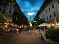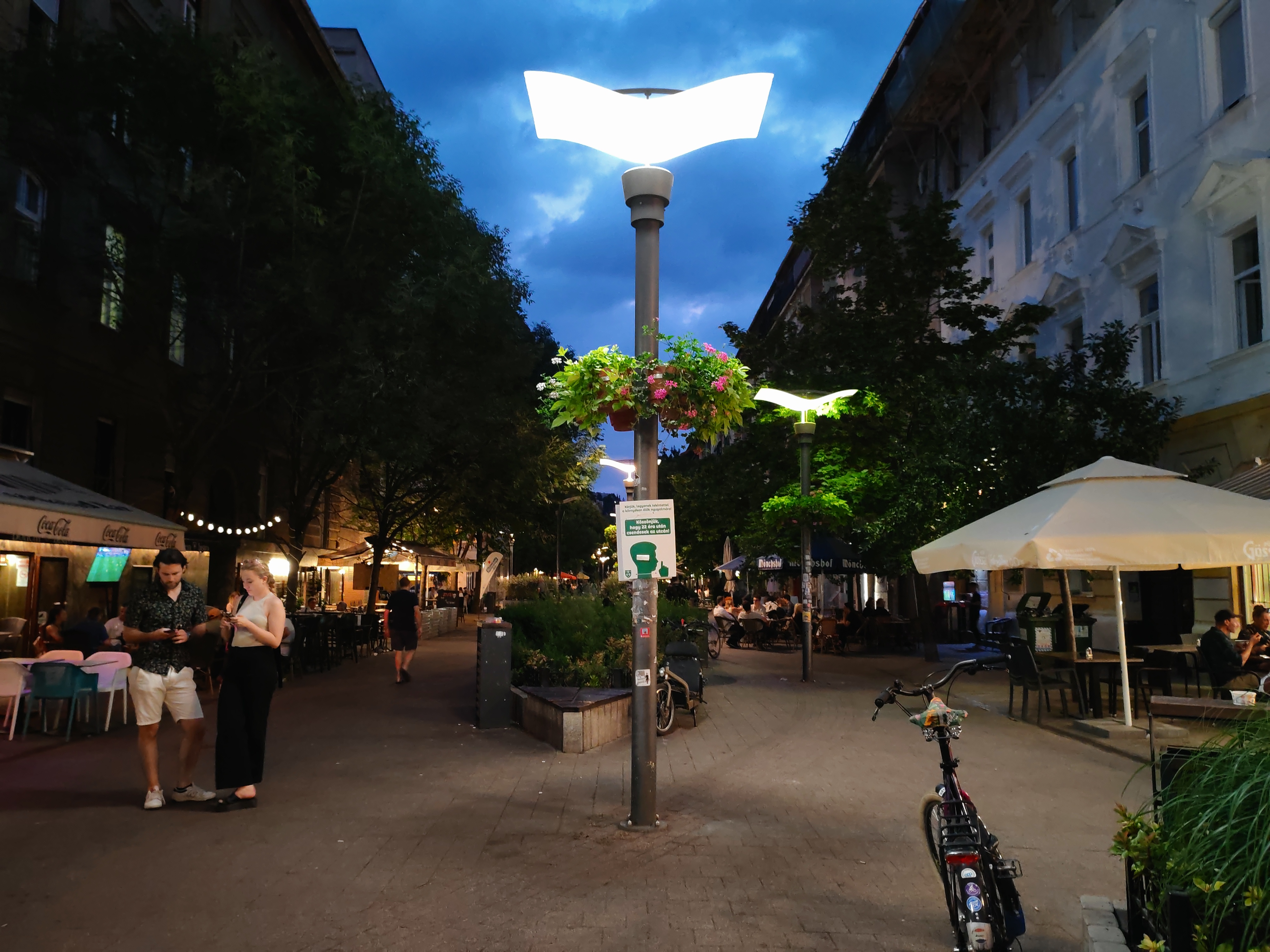 Bár az 50 megapixeles felbontás maradt a főkamera esetében, az efféle példa már nappal aláhúzza a visszalépést a 200 Pro 1/1,3”-es szenzorméretről 1/1,56”-re, bár látványosabb a lencse gyengébb rajzolata a széleken (f/1,95, OIS, PDAF). A Honor 200 amúgy picit szélesebb látóterű optikát kapott 23 mm-en, viszont felesleges Huawei örökségként ez is 27 mm-re vág belőle, 12,5 megapixelre binnelve. Helló, Honor, ennek semmi értelme! A fotók megnyerőek úgy középső részletesség, mint dinamika és fehéregyensúly oldaláról, ám a Pro visszafogottabb telítettségben, zajszűrésben és élesítésben – itt kiváltképp a kékek túlzók és este is sok a színekből. Pedig most is természetes képfeldolgozással rögzítettem a kameraszoftverben kiválasztható három séma közül – itt vethető össze a természetes, a friss és az autentikus.
