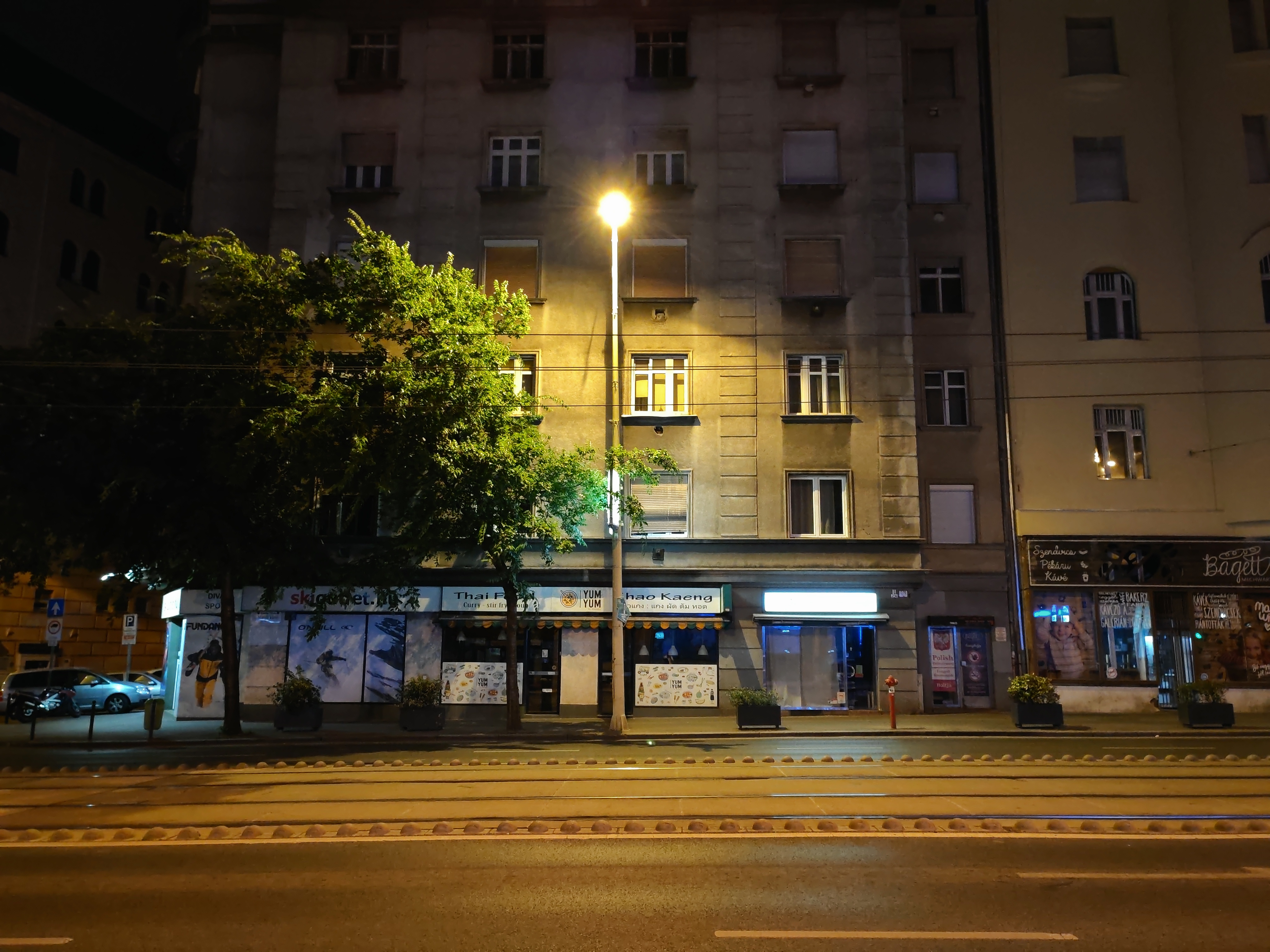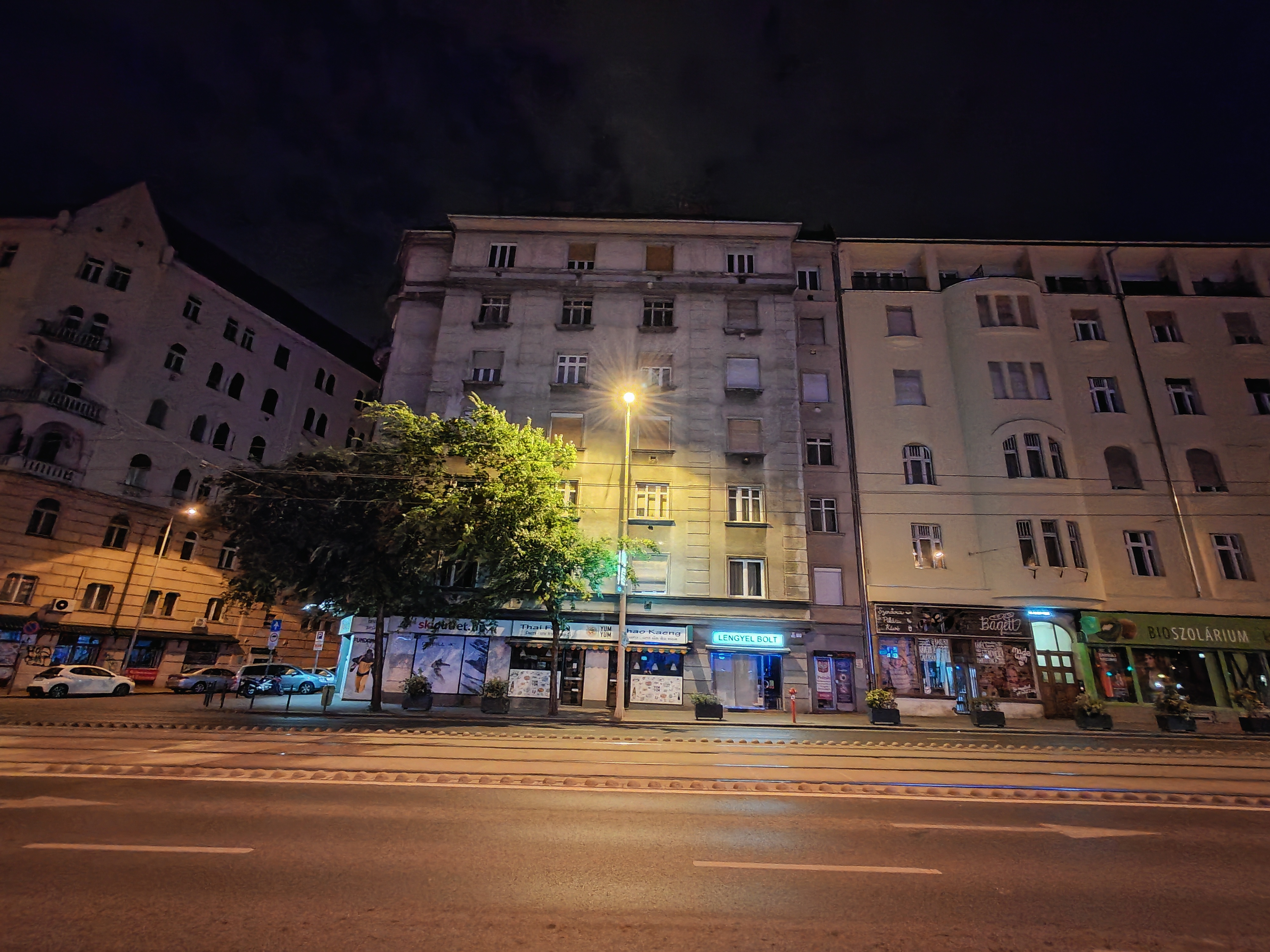 Az ultraszéles kamera 112 fokon nem különösebben nagy látóterű (16 mm, f/2,2, autofókusz), és sem a rajzolat, sem pedig a dinamikaátfogás oldaláról nincs meg a másik két egység színvonala. Már nappal visszafogottabb a részletesség megtolt kékekkel és kiégett részletekkel, este pedig kötelező éjjeli módban rögzíteni, hogy legalább középszerű vonalélességet kapjunk – az automata mód fotói még elmosottabbak a fenti válogatásnál. Azért még mindig jól használhatók ezek a felvételek, ám annyival ügyesebb a 200 Pro fotózásban, hogy megéri érte kifizetni a különbözetet.