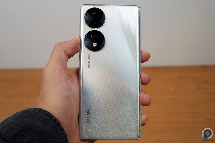 A hátlapon két gyűrű a három kamerának és a kéttónusú vakunak és mellettük az elengedhetetlen AI MATRIX CAMERA felirat, tőle kicsit távolabb pedig a márkanév, amiket a tesztelt modellnél az ezüst színű hátlapra sikerült ezüst színnel rányomni, így legalább nem annyira feltűnő. A kameragyűrűk egyébként kiállnak a hátlap síkjából, még a mellékelt szilikon tokba húzva a Honor 70-et is billegni fog asztalra téve. A 161,4 x 73,3 x 7,91 milliméterével a ház nem nevezhető kicsinek, fogása viszont kellemes, a műanyag használata pedig meghálálja magát abban, hogy 178 grammot nyom csupán az eszköz. Azt viszont tartsuk szem előtt, hogy hivatalos víz- és porálló minősítése nincs a készüléknek!