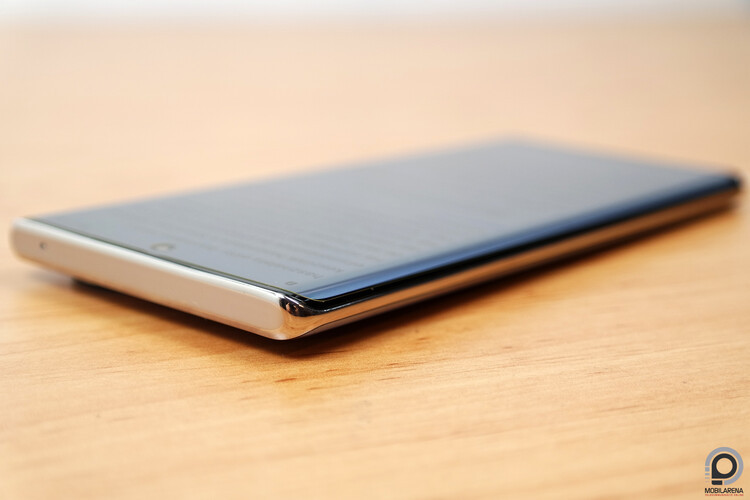 A keret bal szélén semmi, felül is csak a zajszűrésért felelős mikrofon, a jobb szélen pedig lentebb a bekapcsoló gomb, fölötte pedig a hangerőszabályzó kényelmesen elérhető magasságban. A hátlap és az ívelt kijelző szépen hajlik az alumínium hatását keltő keretbe, az összeszerelés minősége jó, a ház integritása is rendben van. Mondhatnánk így akár azt is, hogy minimalista mobil, viszont a Crystal Silver változat, ami nálunk járt, minden csak nem az. A műanyag hátlap üveg hatását próbálja kelteni minden modellben a zöld, a fekete és a kék esetében is, az ezüst tesztdarabunk viszont ezt megfejeli azzal, hogy egyszerre akarja imitálni a kristályokat meg a csillámpor csillogását, a végeredmény pedig feltűnő, de kissé bazári.