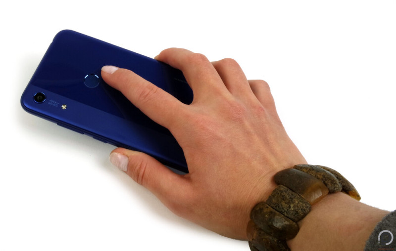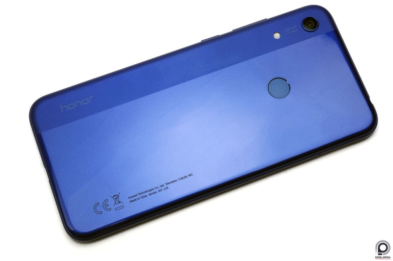 A készülék fogása igen kellemes, bár az egykezes használat nem mindenkinek lesz realitás, a finoman gömbölyödő oldalélek és a laposabb elő- és hátlapi kialakítás abszolút kényelmes. A műanyag konstrukció minőségi és masszív, a hátlap pedig izgalmas kialakítást kapott. A terület körülbelül egyötöde matt, míg a többi része fényes. Ez nem feltűnő, mégis nagyon jól néz ki élőben. A matt hosszanti sávra 13 megapixeles főkamera, LED segédfény és alulra Honor márkajelzés került; a technikai jellegű információk pedig a jobb oldalra, szintén vertikális elrendezésben. A multifunkcionális ujjlenyomat-olvasó a szokott helyen, a hátlap felső harmadában, középen esik pont kézre.