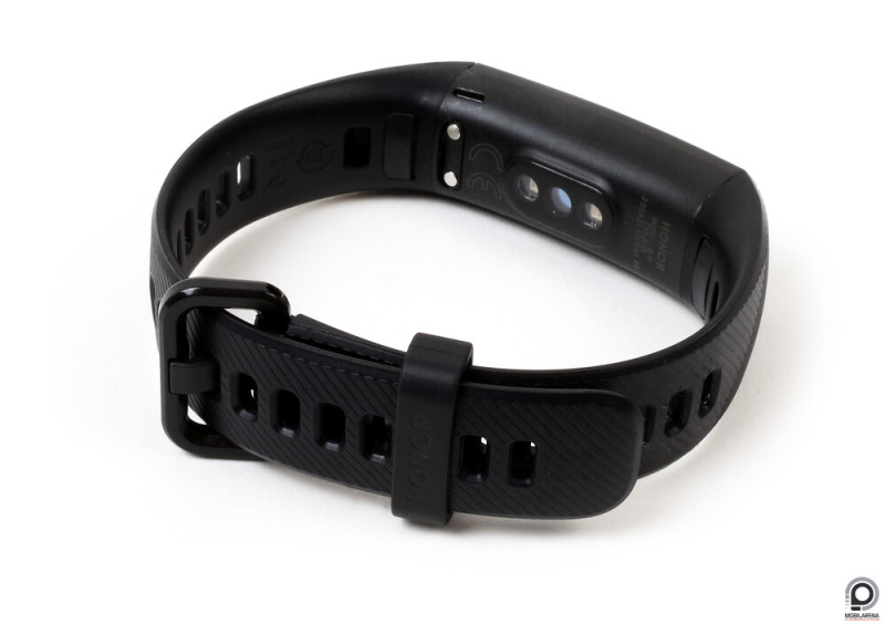 Minden más egyébként változatlan. A készülék továbbra is 43 x 17,2 x 11,5 milliméter és szíjjal együtt 22,7 gramm, ami roppant könnyű viseletté teszi. A szilikon szíj hagyományos zárszerkezetes, a bujtató Honor felirattal, a szíj felülete pedig finom, átlós textúrával díszített, ami annyiban mégsem olyan jó ötlet, hogy kissé koszolódik. Annyiban viszont pont mindegy, hogy az IP68-as certifikáció és az 5 ATM nyomástűrés lehetővé teszi a víz alatti használatot, így a tisztítás sem gond.