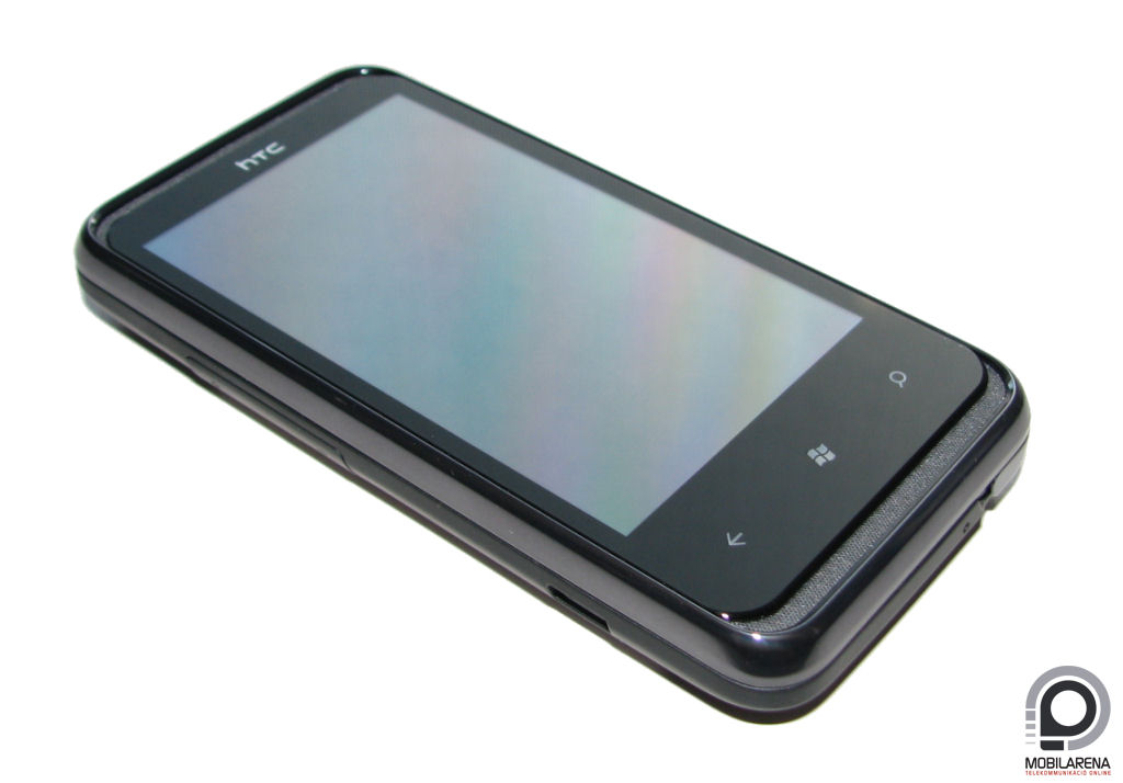 Az előlap fő eleme ezúttal is a kijelző, ami itt 3,6 hüvelykes képátlóval rendelkezik. A felbontás a megszokott WVGA (480x800 pixel), így ennek és a 16 millió színárnyalatnak köszönhetően a képminőség korrekt. Érdekes, hogy még a gyártó honlapján se közlik, milyen kijelzővel szerelték, de legjobb esetben is Super LCD-ről lehetne szó. Én viszont inkább sima TFT-re tippelek, mivel bár kinti fényben elég jól olvasható, a betekintési szöge nem az igazi, elég hamar eltorzulnak a színek. A kijelzőt fedő üveglap mögött rejtőznek a szenzorok is, meg egy szolid HTC felirat is került rá. Alatta és felette fémrácsokat látunk, hasonlóan a HD7-hez, de sajnos az alsó rész pusztán dísz. Felül viszont tényleg egy hangszórót tettek mögé, melynek hangereje és minősége is megfelelő. A kijelző alatt a Microsoft által előírt három gomb sorakozik, érintős kivitelben.
