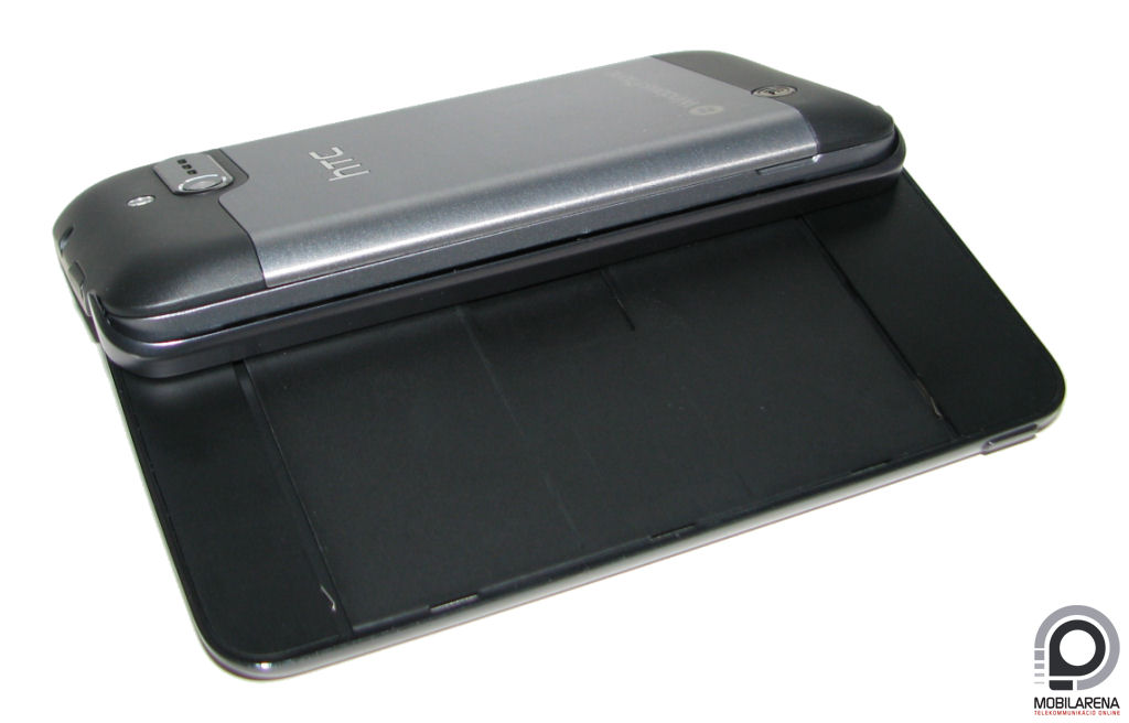 …ha a billentyűzet részt nem rontották volna el. A Desire Z-hez hasonlóan ide is egy teljesen egyedi megoldást szereltek be, aminek köszönhetően az eltolt kijelző automatikusan fel is nyílik egy meghatározott szögben. A még a Touch Pro2, illetve Kaiser típusokból továbbhozott megoldás szerintem nagyon klassz. Mivel a kijelző fel is nyílik, így asztalon kicsit laptopra hasonlít, de kézben is kényelmesebb így használni. Ezúttal a mechanika működése sem akármilyen, mivel nyitott állapotban a fedlap belesüllyed az alsó részbe, miközben egy takarófedél hátulról automatikusan elfedi a mechanikát és a két rész közötti rést. Igényes, szép és okos megoldás, csak nem sikerült tökéletesen kivitelezni. A nyitásnál és csukásnál is elfordul, hogy a kijelző beakad, megszorul csúsztatás közben. Továbbá becsukva elég nagy holtjátéka van a cuccnak, ugyanakkor a mechanika mégis masszívnak és strapabírónak látszik és ha rááll a kezünk, akkor könnyedén működik. Ja, és ez nem csukódik/nyílik magától, meg az ujjunkra, mint a Desire Z-nél, továbbá a súlyponttal sincs gond, kinyitva sem borul fel.