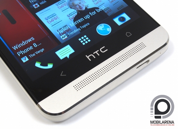 A készülék előlapja meglehetősen szokatlan, a gyártók ritkán pakolják ide a hangkeltő egységeket; legutóbb a Samsung Galaxy Music esetén láttunk ilyet. A hangszórópár kialakításakor a tavalyi One szériához hasonló módszert alkalmaztak, a különálló rácsot mikrofuratok váltották le. Ezek egyenesen az alumíniumba vájták, köztes anyag használata nélkül, így nem bontja meg a unibody kivitel hangulatát. Szám szerint összesen 47 lyuk kapott helyet egy sorban, így alul és felül is ennek a négyszerese, azaz egyenként 188 mélyedés látható. Az értesítő LED szintén a One X esetén látottnak megfelelően került kialakításra, a zöld és piros színnel operáló villogó az egyik furatban kapott helyet. Már tehát a kialakításon is jól látszik, hogy a HTC komoly hangsúlyt fektetett a kihangosításra, a Boomsoundnak nevezett megoldás valóban jól szól, az irtó masszív hangerő mellett a mélyek is erőteljesek, a kétharmadáig feltekerve viszont már masszív a torzulás. Természetesen hiú ábrándokat azért nem szabad kergetni, minőségi zenehallgatásra a One sem alkalmas (mint ahogy egyetlen mobil sem), de a telefonok körében kiemelkedő a teljesítménye.