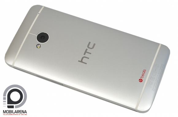A telefon hátlapját szálcsiszolt alumínium borítja, a unibody filozófiát követve a készülék megbonthatatlan, azaz (célszerszám nélkül) nem lehet leszedni a fedlapot. A szürke fémet alul egy Beats audio, középen egy HTC felirat töri meg, az alsó és felső fertályt egy-egy fehér műanyagsáv szeli át. Felül található a kamera és a LED villanó.